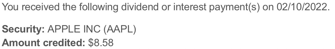 주식이라고는 처음 해보는데, 올해 초에 구매한 애플 주식에 대해서 2월 10일에 배당금이 나왔다. 얼마 가지고 있지 않다보니 배당금도 엄청 적게 나왔는데, 인터넷에서 찾아보니 원래 애플은 주식 배당금이 매우 낮은 회사였다. 배당금은 보유하고 있는 한주당 $0.22이고 39주를 보유하고 있었으니 $8.58이 나왔다.