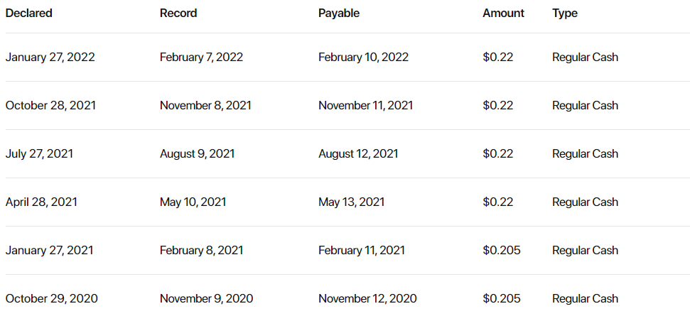 2020년에 1/4 액면가 분할을 한 후 계속 한 주당 $0.2가 조금 넘는 배당을 하고 있는 듯 하다. 1년에 2월, 5월, 8월, 11월에 배당이 나오니 한달만 더 있으면 또 배당이 나올 듯 하다.