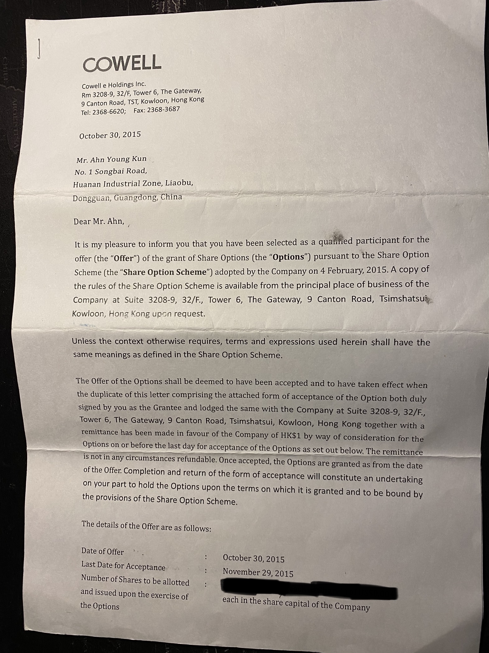 이전회사에서 퇴직 후 지금 회사로 이직하기 전에 그 전에 받았었던 스톡옵션을 실행했었다. 2015년에 홍콩증시에 상장하였는데, 이때 몇몇 임원들 및 몇몇 주요 직원들에게도 스톡옵션을 주었었다. 직원들의 대부분의 개발실 팀장들이나 핵심 엔지니어였지만, 당시 품질팀에 속해있던 나에게도 스톡옵션이 주어졌었다. 하지만 이후 회사가 역성장을 하고 신규 개발제품이 연속으로 실패하면서 회사에 위기가 찾아왔고 당연히 주가는 곤두박칠쳐서 당시 스톡옵션을 받았던 임원들과 직원들의 대부분이 퇴사 및 이직을 하였었다.