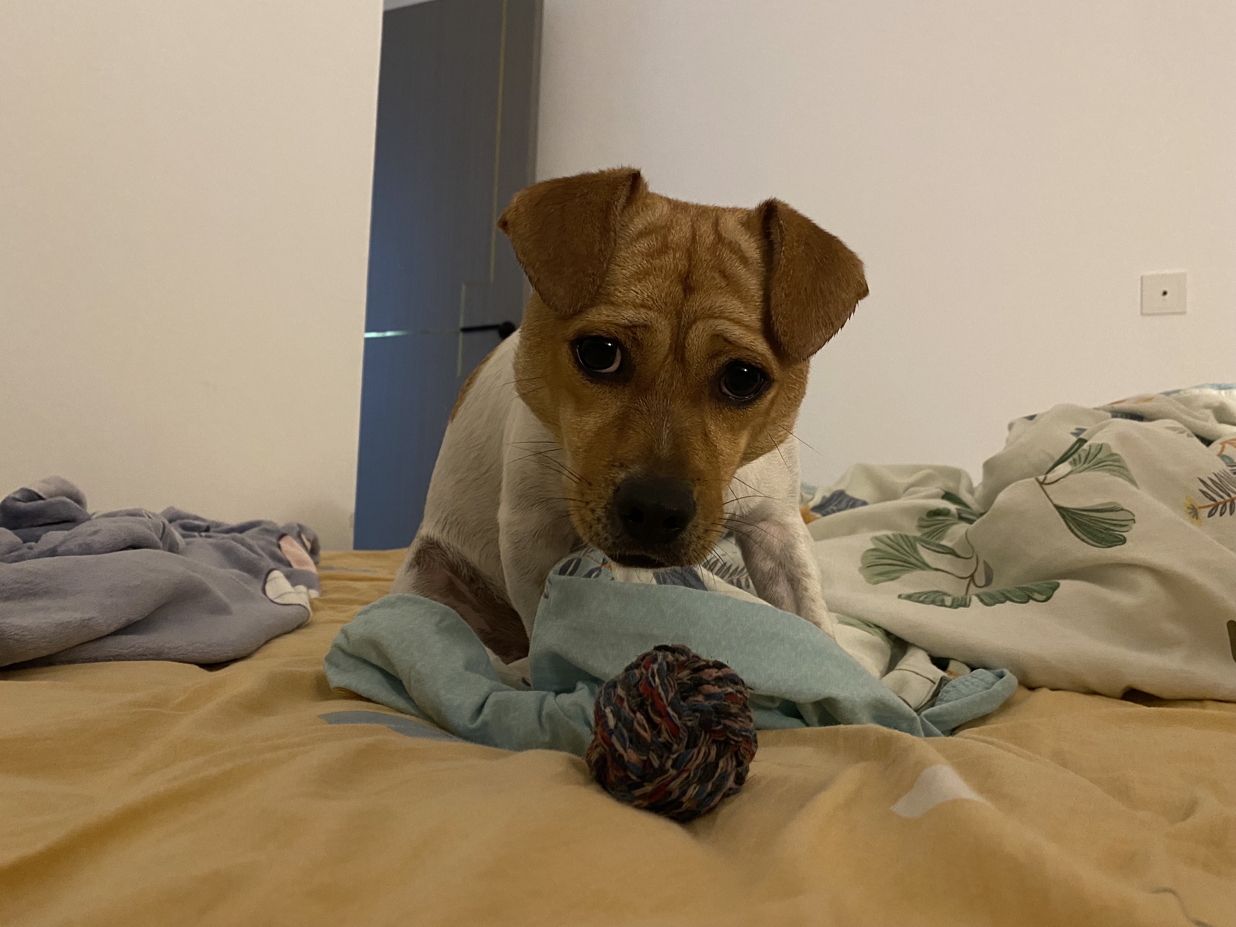 자려고 누웠지만 침대까지 가져와서 놀자고 한다.