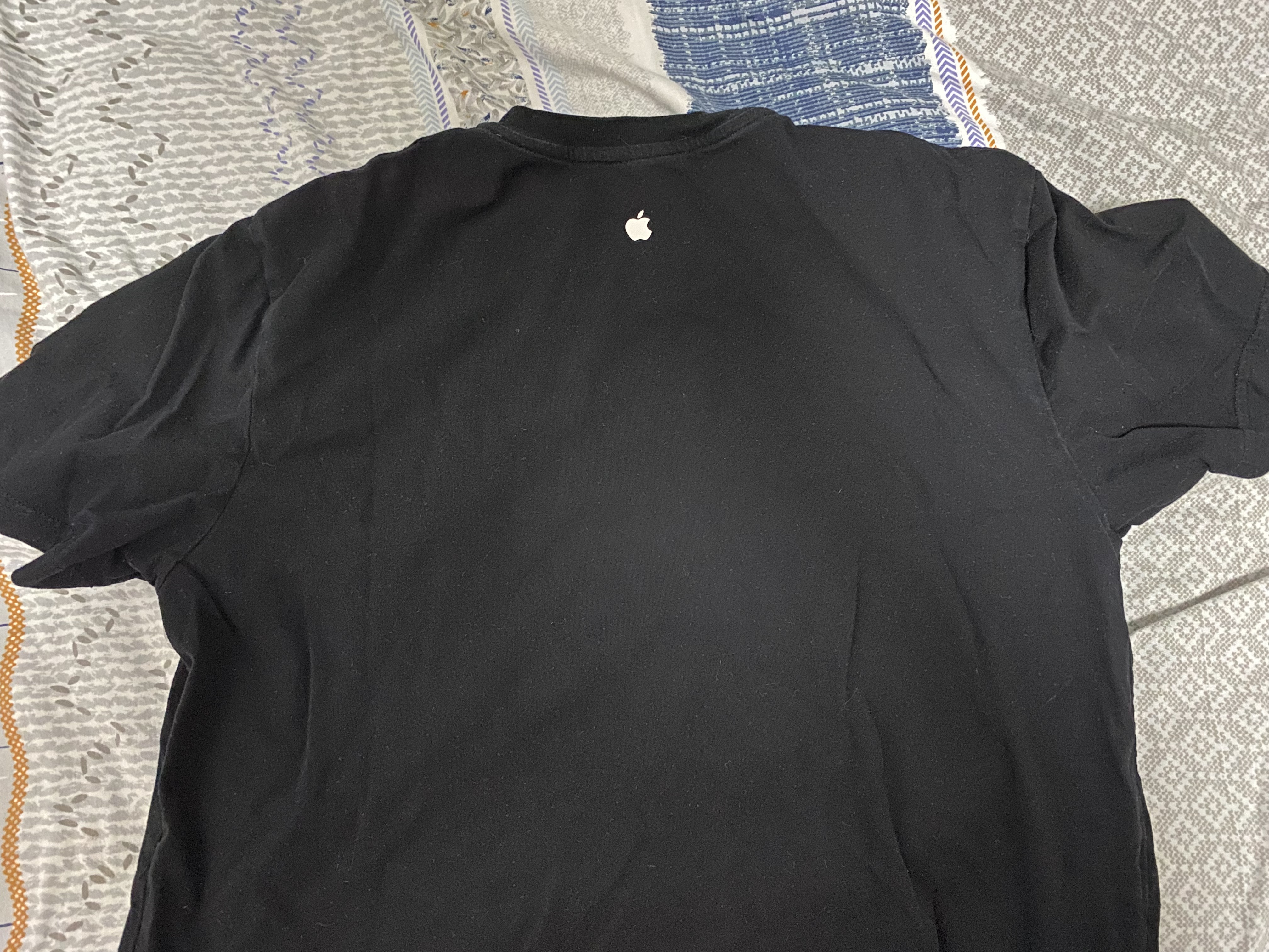 검은 라운드넥 티셔츠. 보온병과 함께 가장 많이 사용하는 애플 로고 제품.