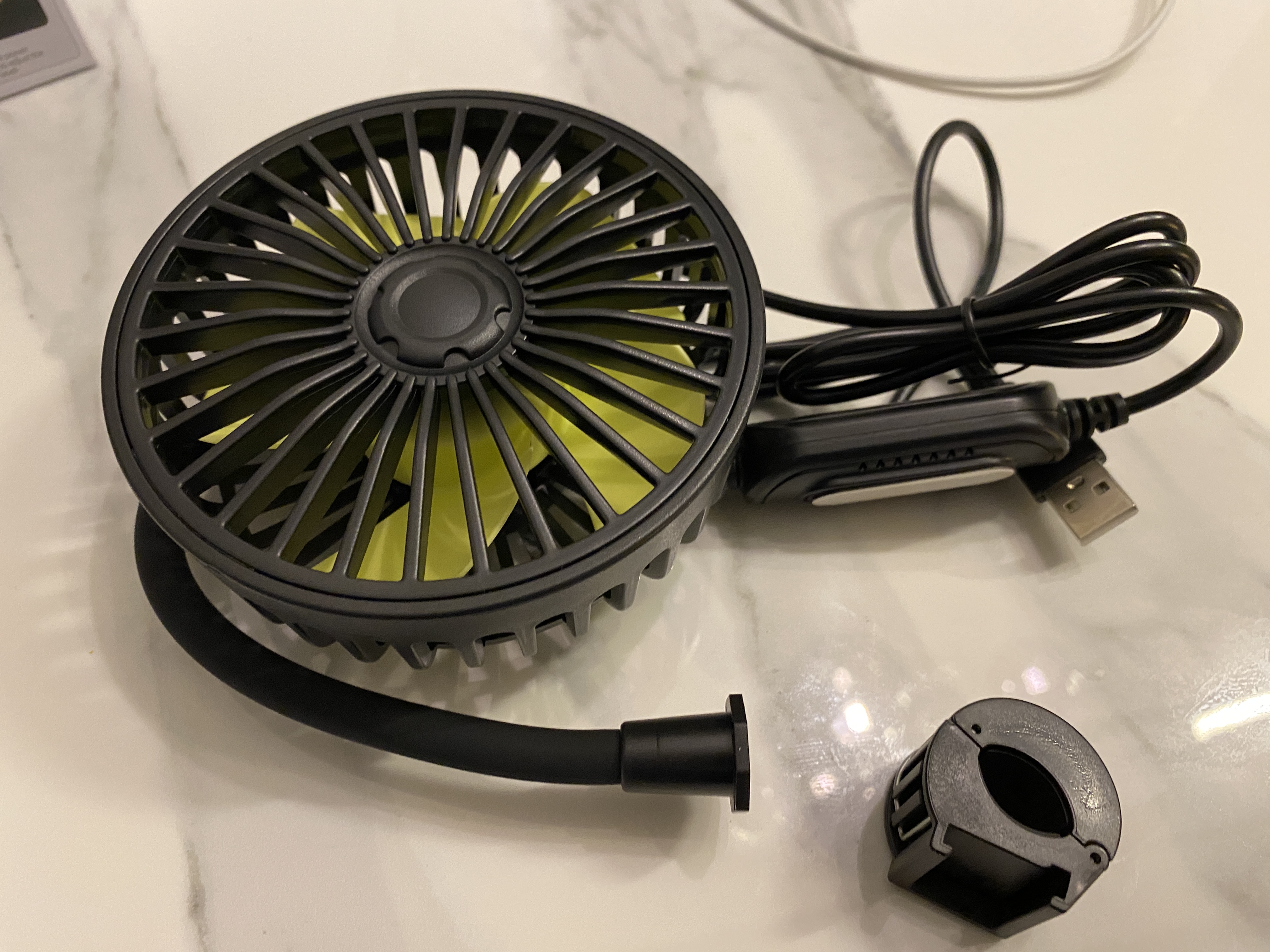 장거리 운전을 하다보면 잠시 차에서 눈을 붙여야 할 때가 있는데, 창문을 열어놓자니 벌레가 너무 많이 들어오고 닫고 있으면 너무 덥고 답답해졌다. 그렇다고 시동을 켜놓고 공회전을 시키면서 에어컨을 켜 놓고 있을 수도 없어서 USB 차량용 선풍기를 구매하여 설치하였다. 타오바오에서 23위안에 구매하였는데 원화로는 대략 4000원 정도이다.