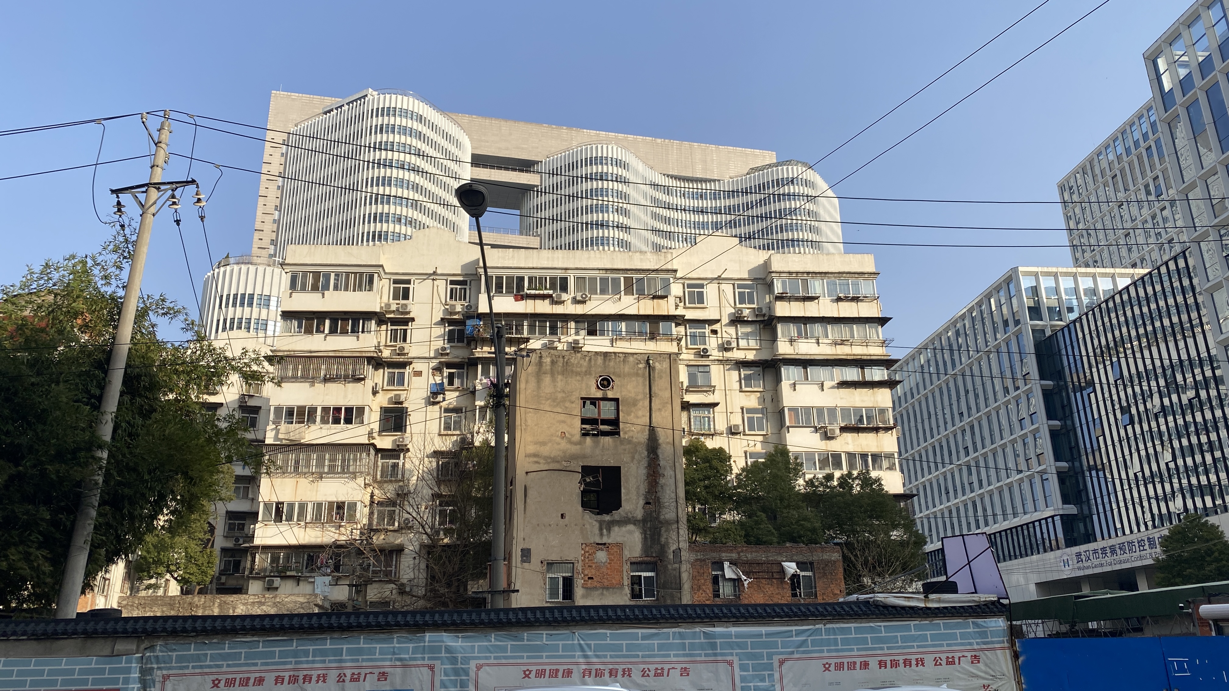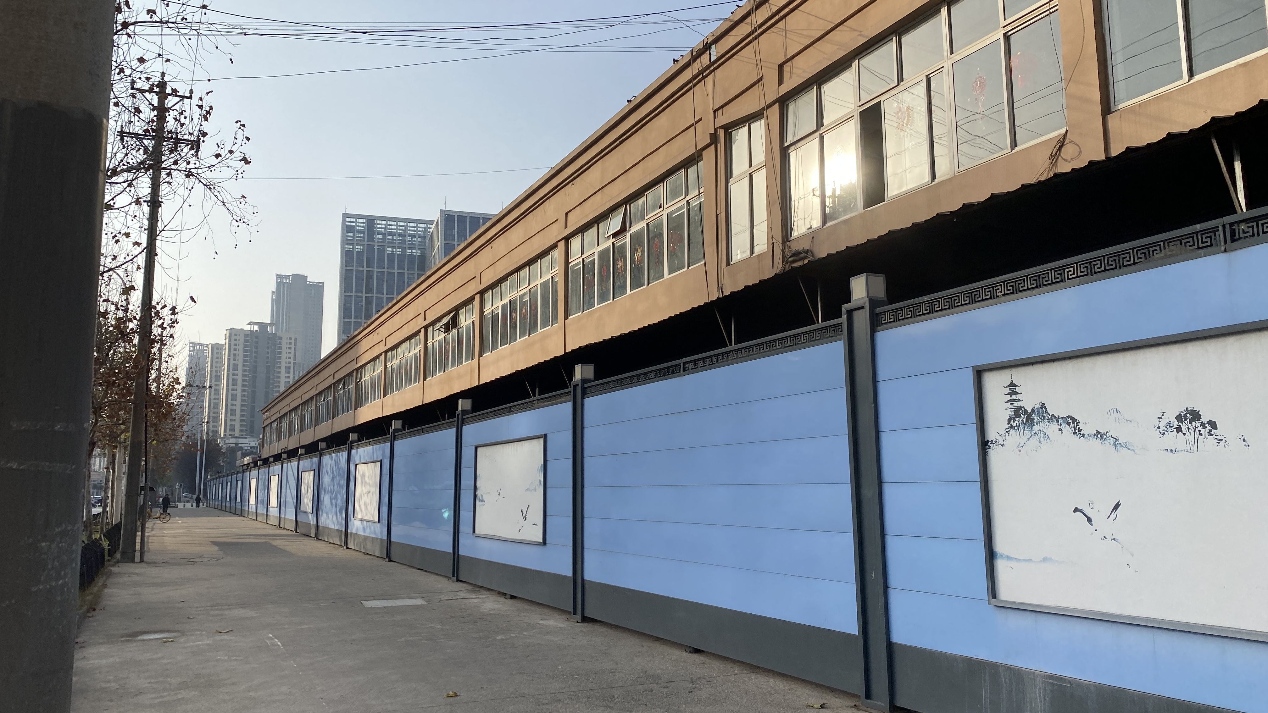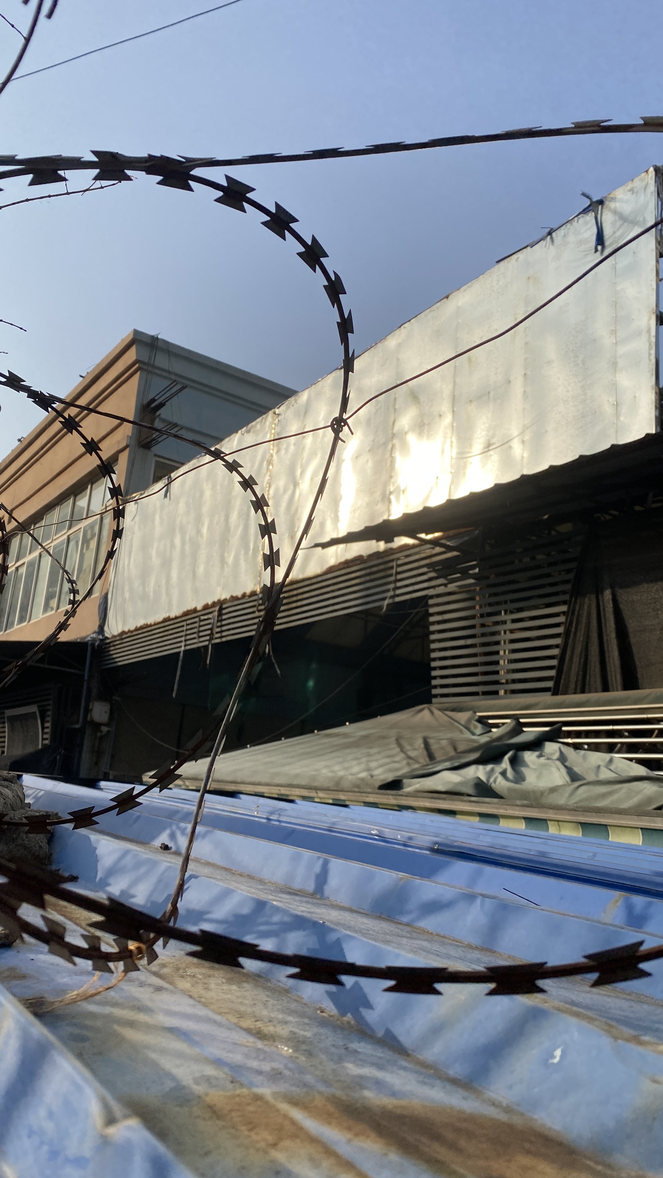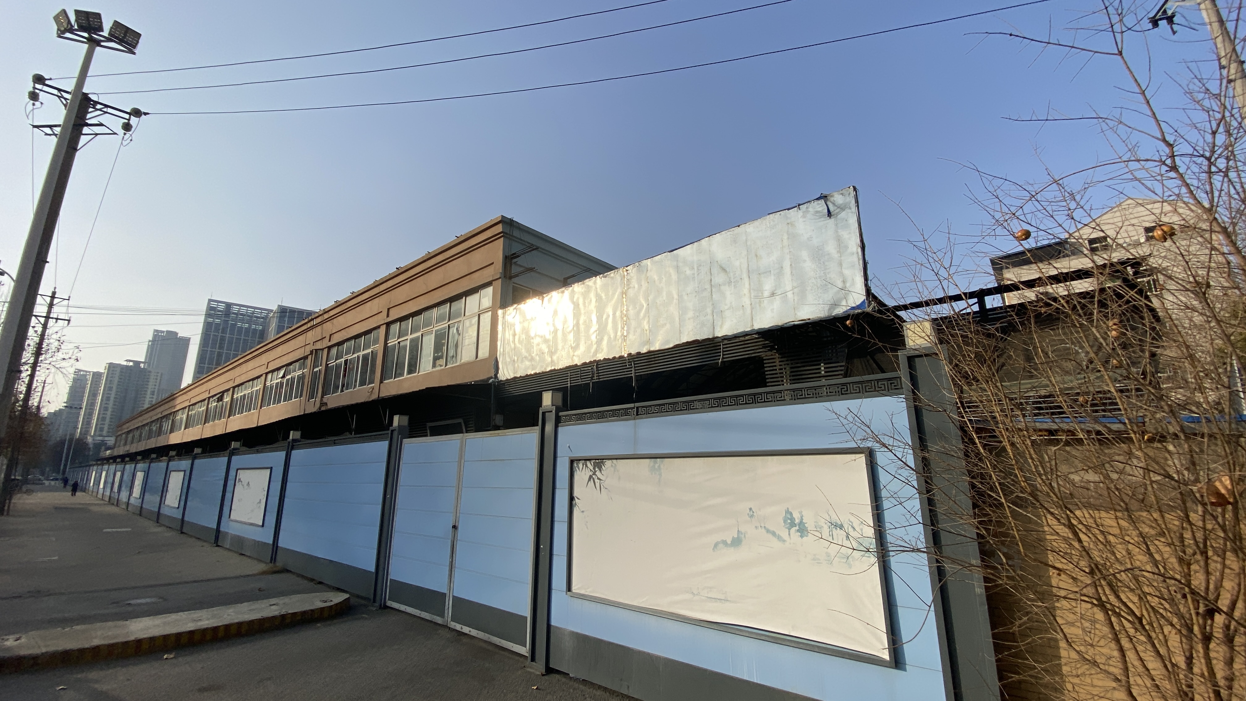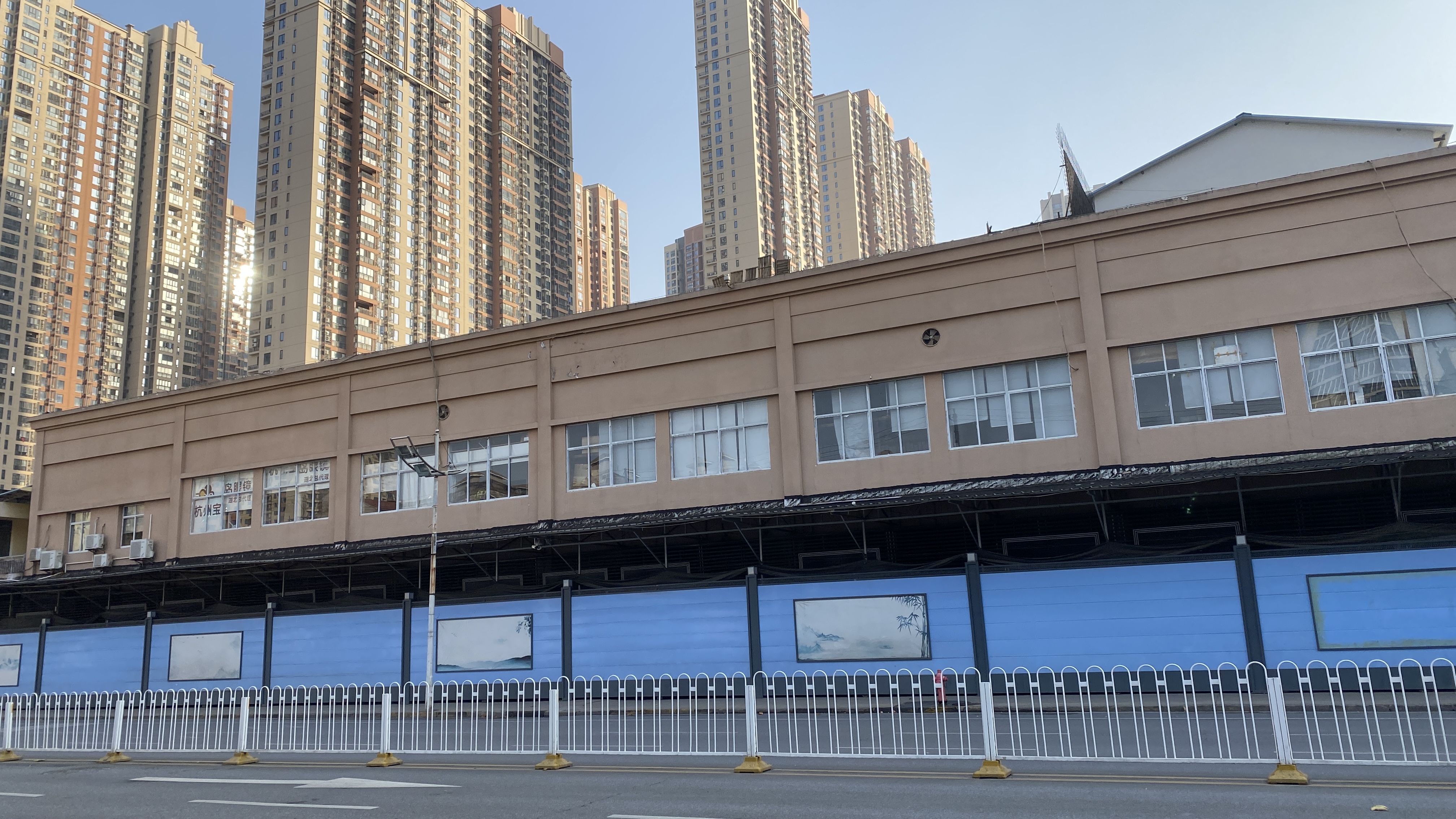 대략 호텔에서 2km정도로 걸어서 도착한 우한해산물도매시장. 완전히 폐쇄되었다. 파란색 담 너머가 해산물 시장 건물인데, 높게 담을 설치하고 간판도 제거해 버려서, 처음에는 잘 못 왔나 싶었다.