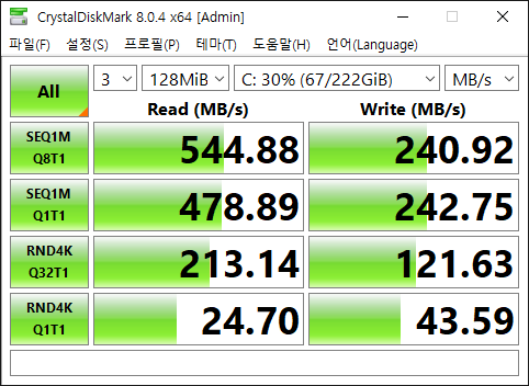 장착 후, 인식에 문제 없이 윈도우까지 설치하였다. 2011년에 출시된 레노버 V570에 사용 중인, 2012년에 출시된 인텔 520 SSD와 비교. HTPC와 노트북 둘 다 Intel 2세대 i7 CPU를 사용하고 있어서 CPU에 의한 차이는 거의 없을 것인데 KingSpec SSD의 읽기 속도는 Intel SSD에 반정도 밖에 안나온다. 쓰기 속도는 비슷하다. 둘다 SATA2 인터페이스.