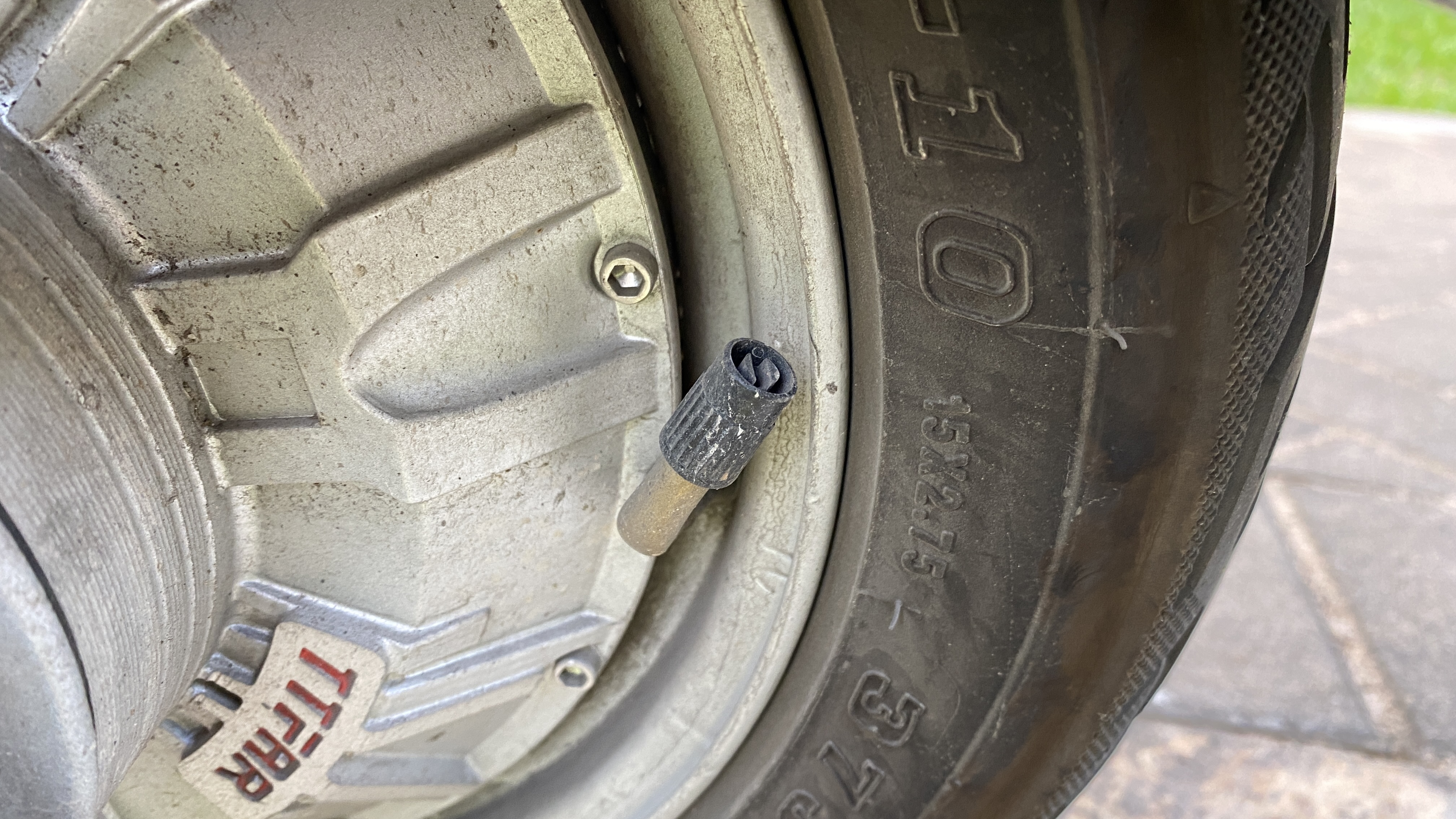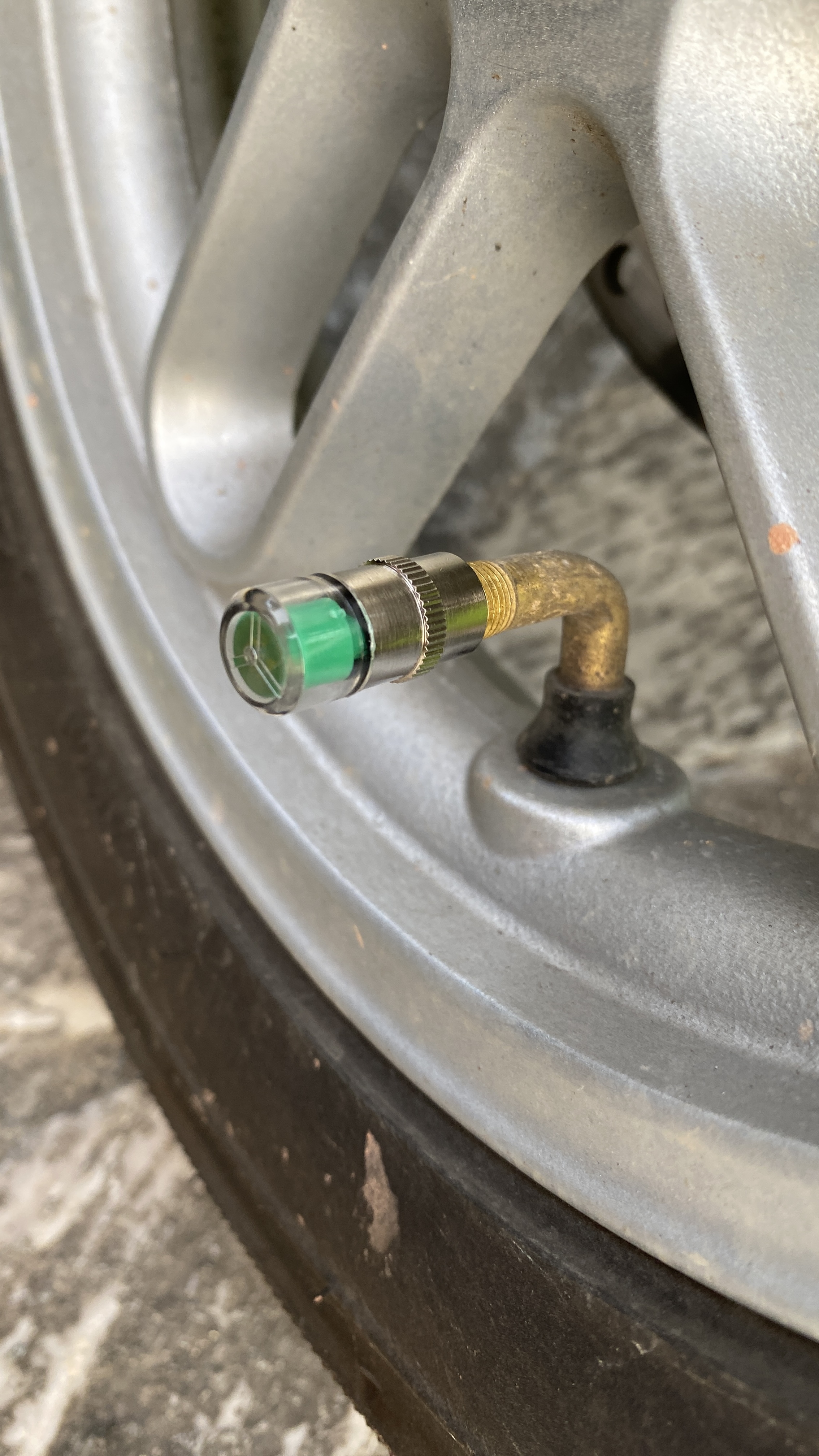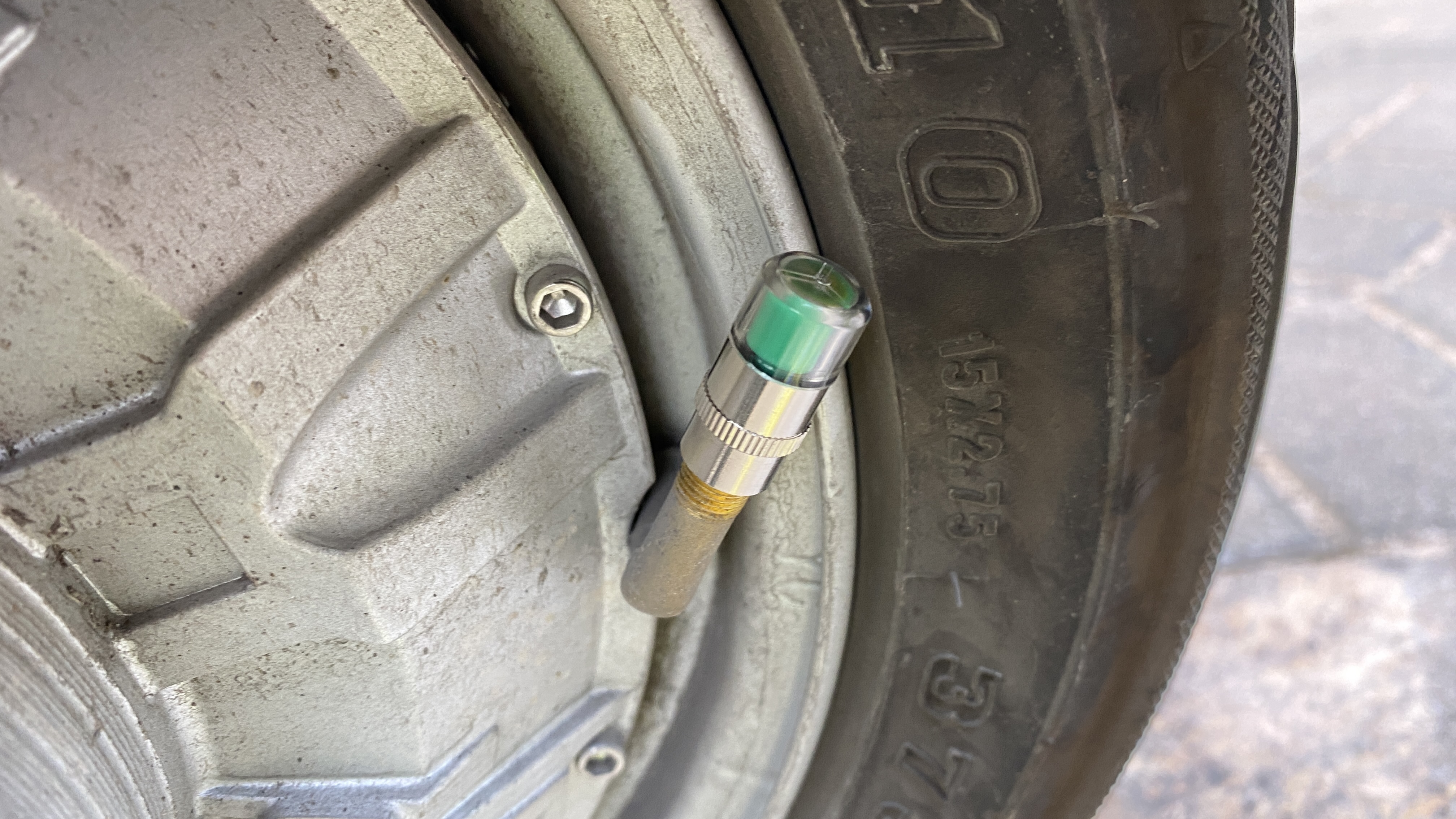 전기오토바이용 타이어 압력계를 설치해 보았다. 타이어 압력값이 실시간으로 모니터에 표시되는 제품들은 100-200위안(2-4만원)이나 해서 저렴한 것을 찾아보던 중 10위안(1,900원)에 파는 제품을 발견하였다. 정상, 경고, 위험 세가지 상태만 표시해 주는 간단한 압력계이다. 압력계를 타이어 공기압 주입구에 끼우면 그 압력에 따라 녹색(정상), 노락색(경고), 빨간색(위험)으로 표시된다.