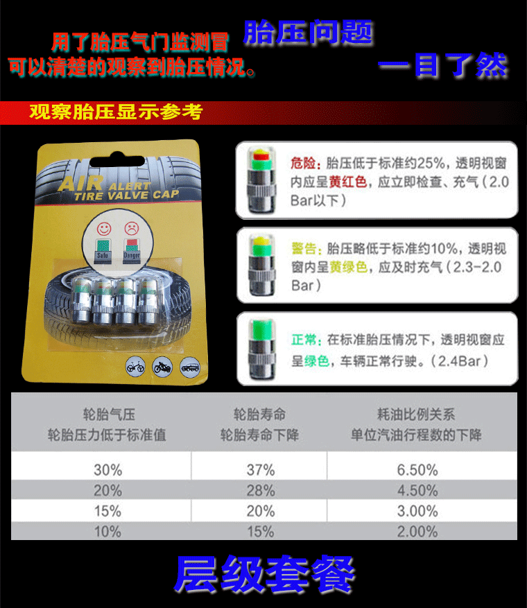 설명에 의하면 위험을 표시하는 적색은 2.0bar (29psi)이하 일 때, 경고를 표시하는 노란색은 2.0~2.3bar (29~33psi)사이, 정상을 표시하는 녹색은 2.4bar (34psi)이상일 때 나타난다고 한다. 차종마다 적정 공기압이 다른데 정해진 타이어압 구간만 '정상'으로 표시하는 방식이라, 뭔가 아쉬운 제품이지만 가격이 가격이니만큼 가격에 대한 값어치는 한다고 생각된다.