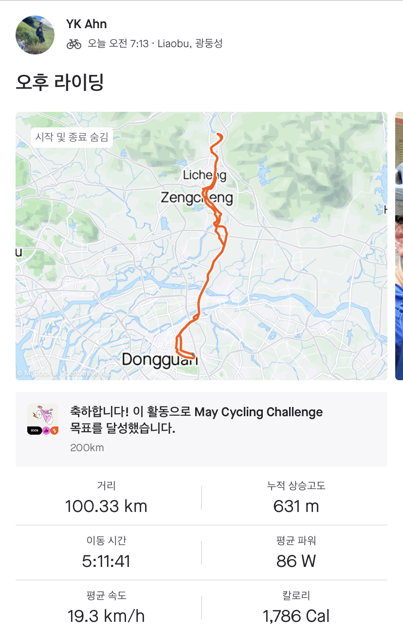 | 중국 노동절 공휴일 자전거 라이딩, 97km (0) | 2023.05.09 |