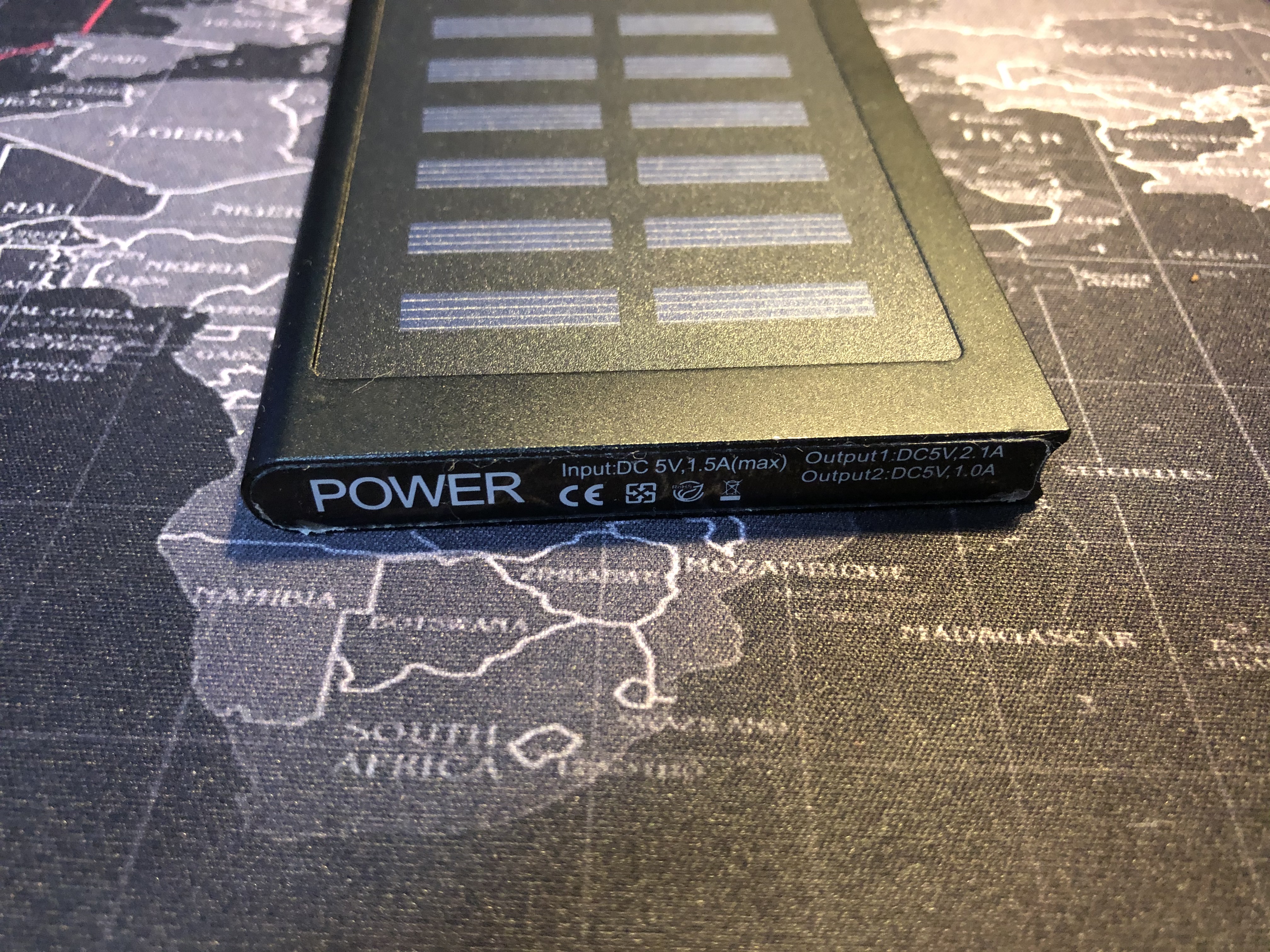 두께가 얇고 크기는 아이폰X보다 약간 크다. 출력단자는 1A와 2.1A단자 두개가 있으며, micro USB로 태양전지가 아닌 일반 5V 직류로 충전할 수 있다. 중간에 매우 작은 LED 가 달려있는데, 보통 태양전지 충전지가 캠핑이나 여행자를 타겟으로 하기 때문에 이들의 편의를 위한 것인 듯 하다.