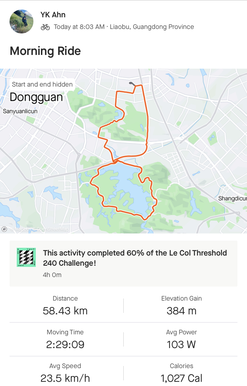 | 중국 국경절 휴일 자전거 라이딩, 101km (0) | 2023.10.01 |