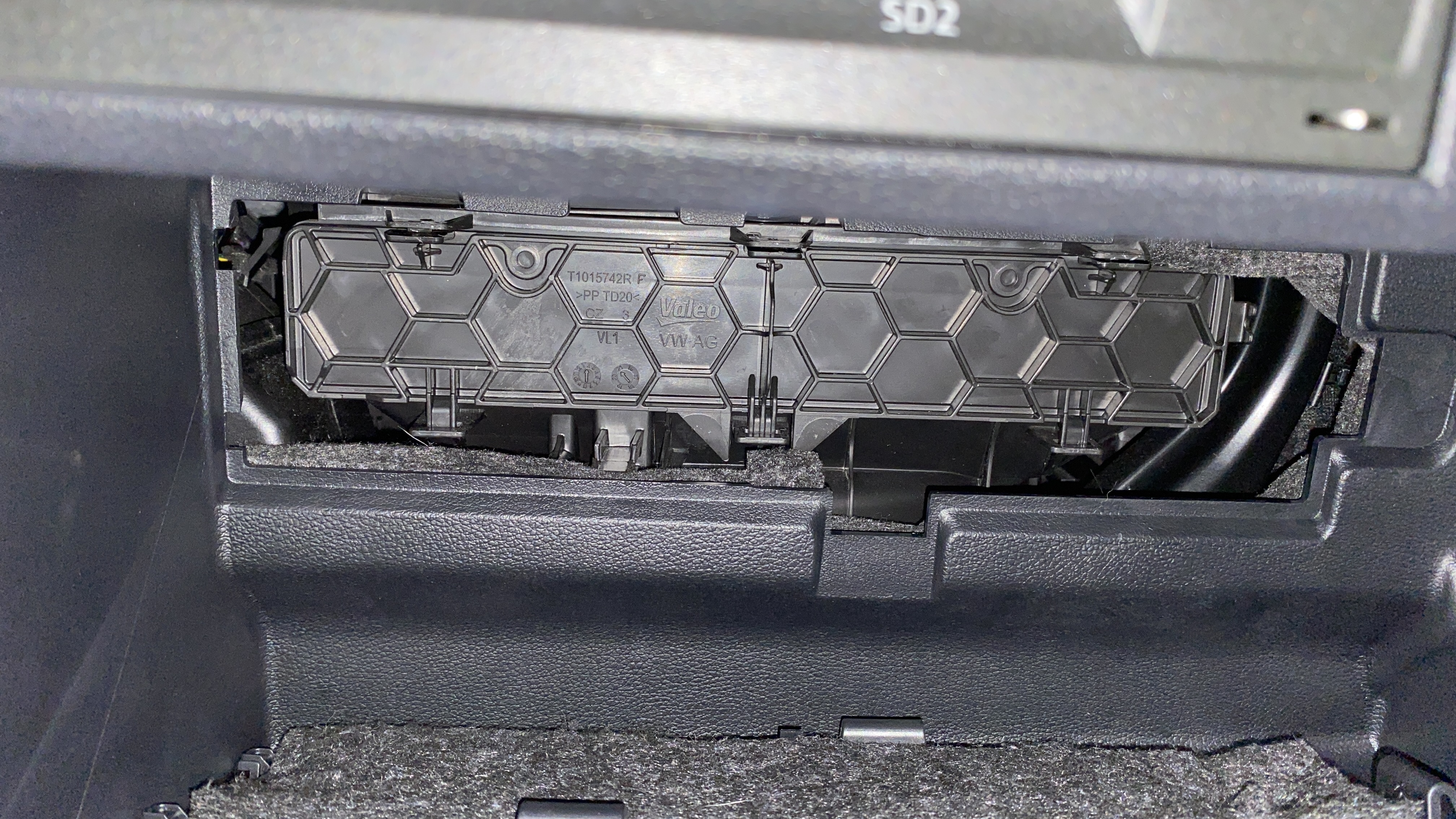 글러브 박스를 열면 안쪽에 뭐가 있는지 궁금하게 만드는 커버가 있다. 오른쪽, 위 그리고 아래에 3개의 걸쇠가 있는데 살짝 당겨서 걸쇠를 풀어서 커버를 제거해 준다.