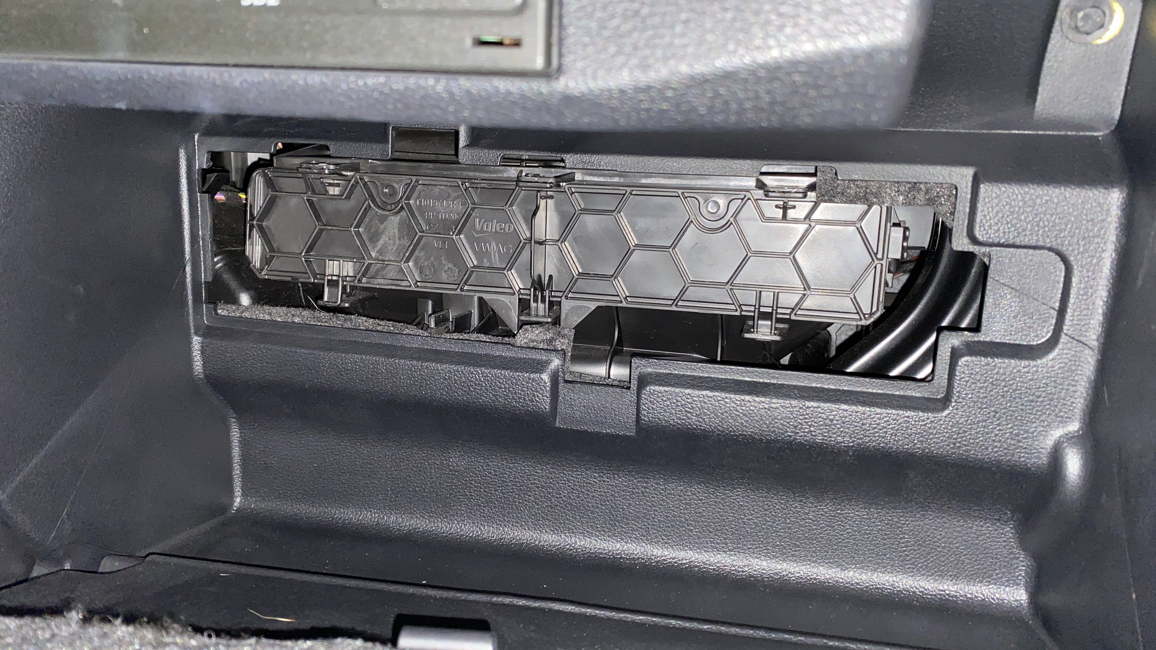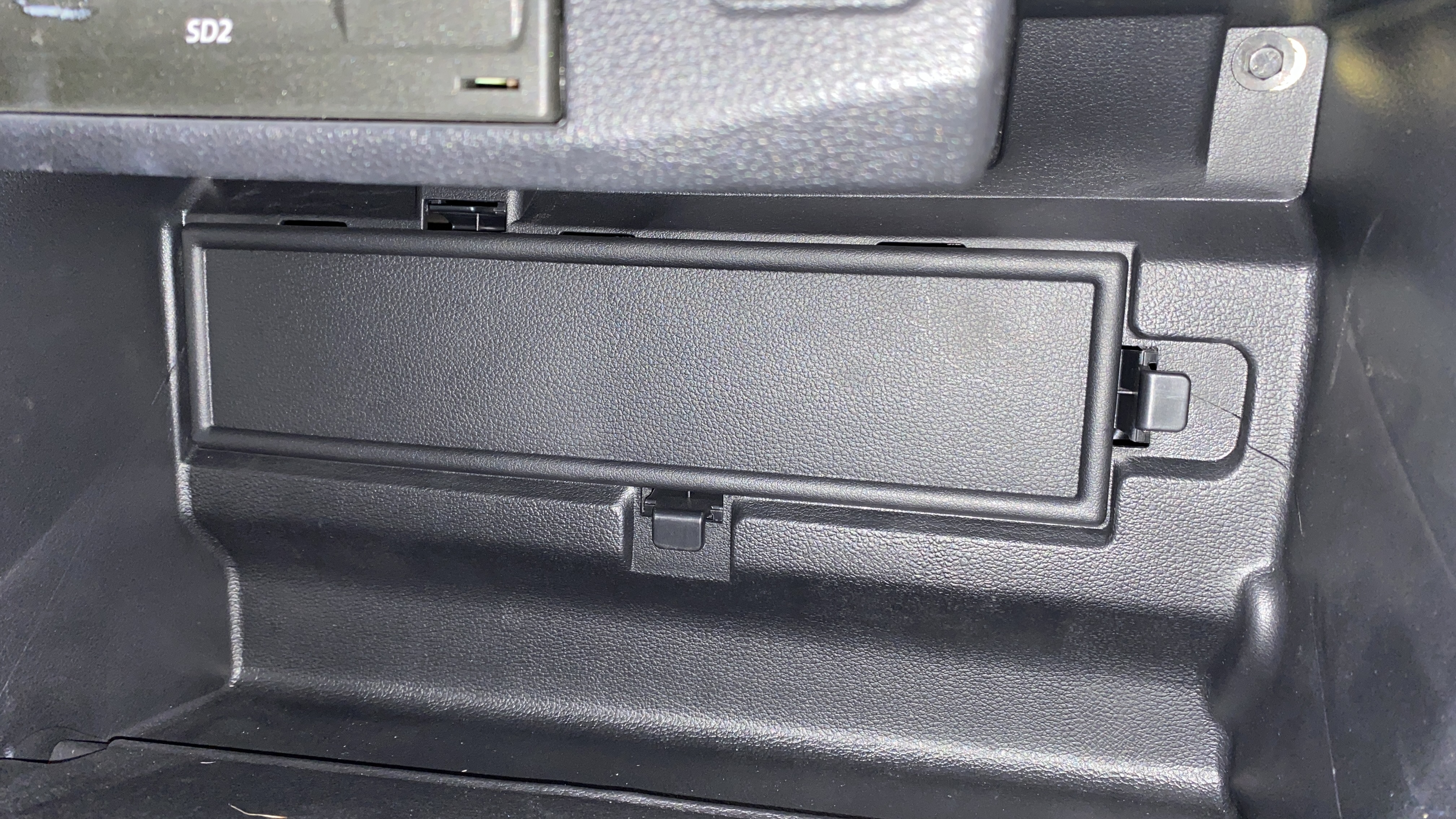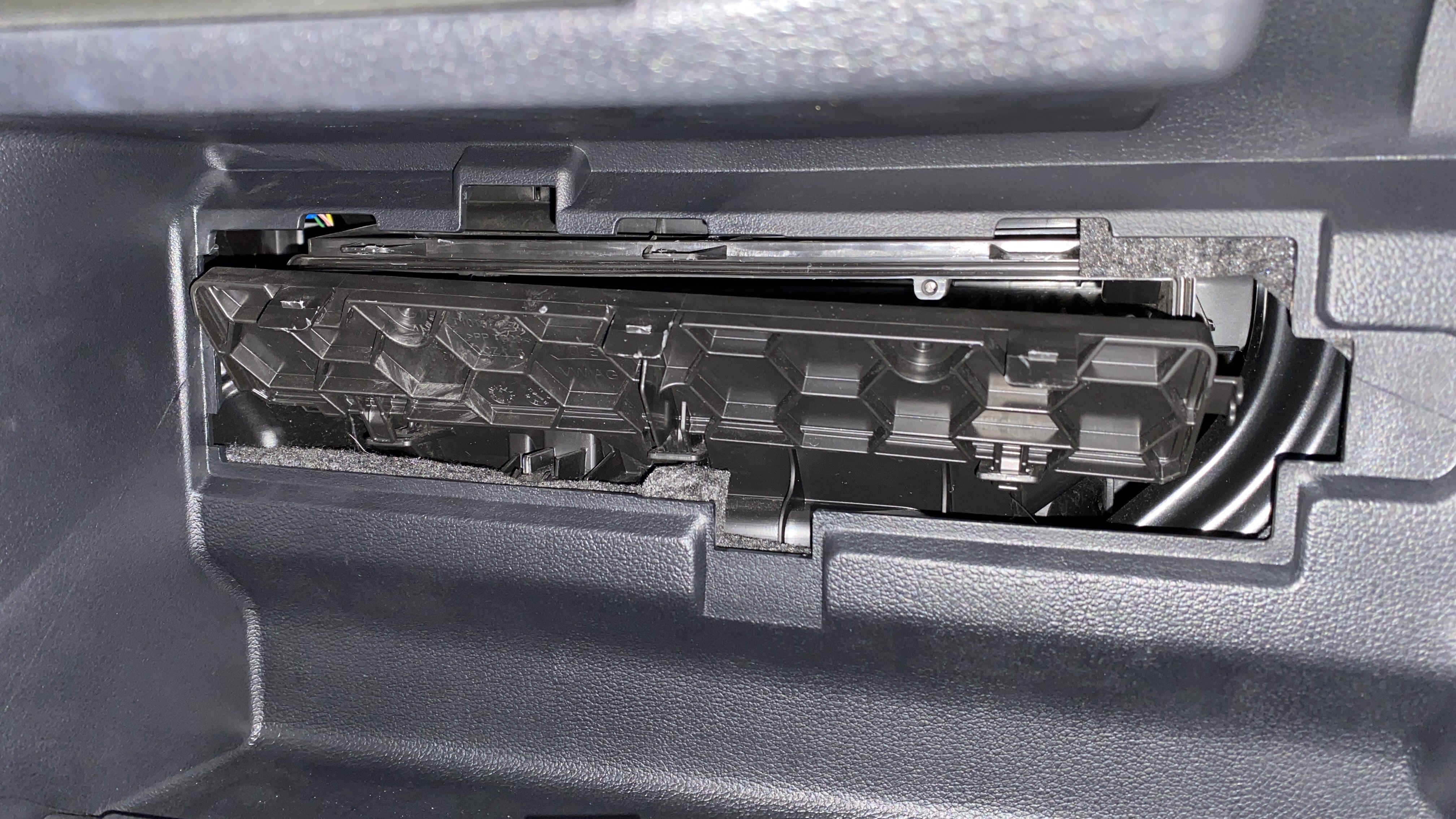 글러브 박스를 열면 안쪽에 뭐가 있는지 궁금하게 만드는 커버가 있다. 오른쪽, 위 그리고 아래에 3개의 걸쇠가 있는데 살짝 당겨서 걸쇠를 풀어서 커버를 제거해 준다.