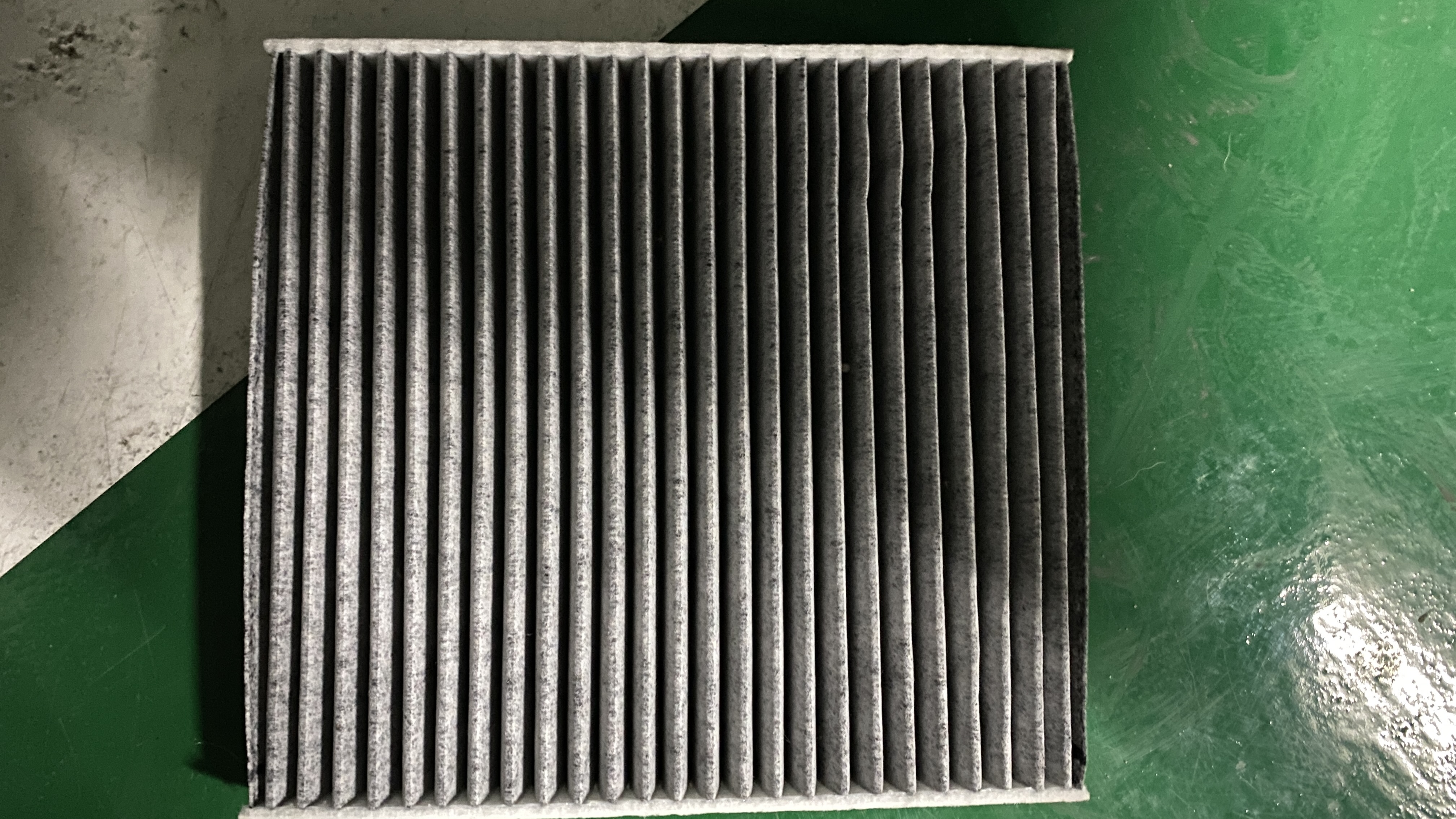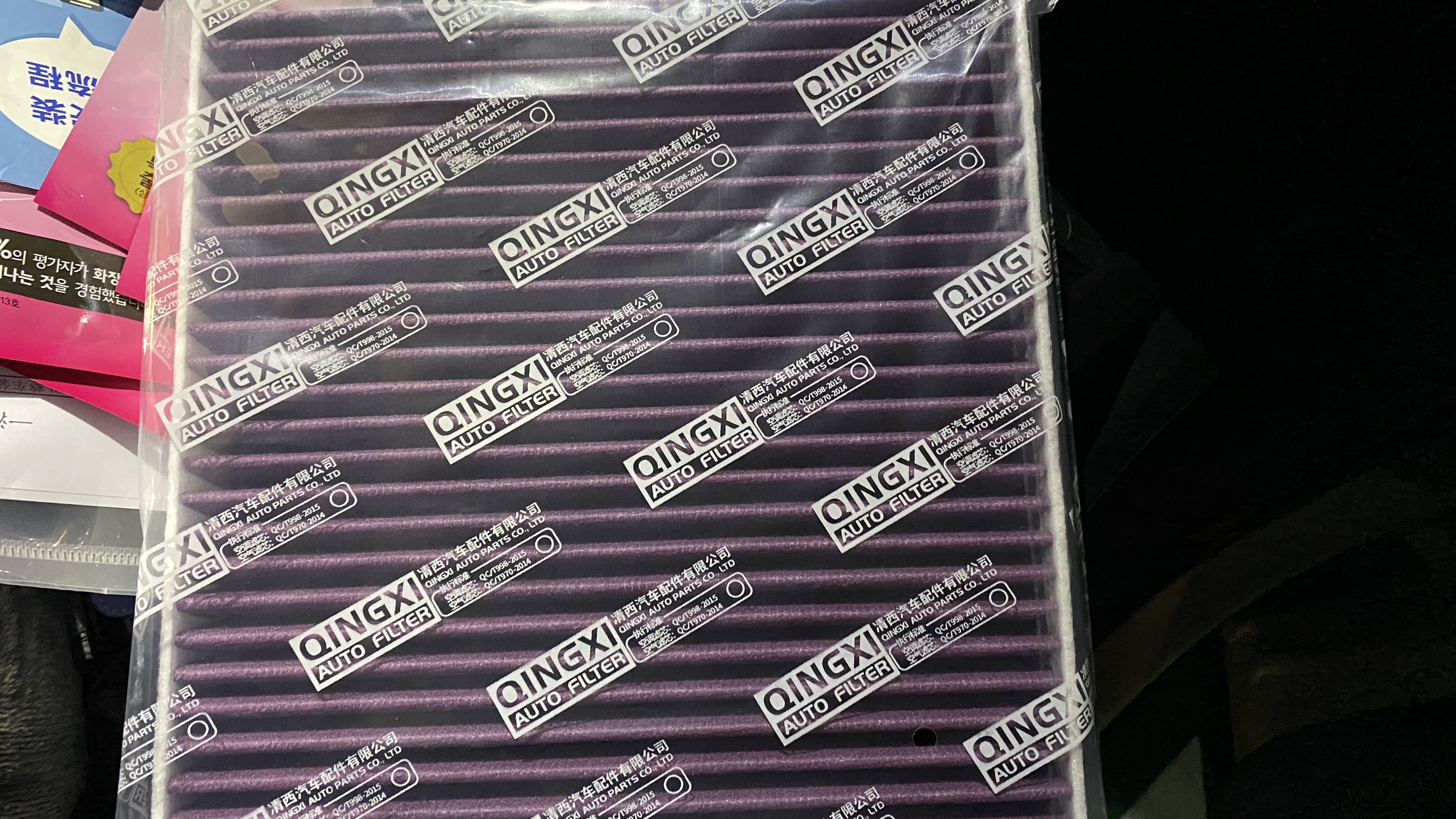필터를 꺼내서 확인해 보니 역시 방향을 잘 못 넣은 것 같다. 필터의 위쪽에 이물들이 떨어져 있는 것으로 보아 공기 흐름 방향은 위에서 아래인 것이다. 필터 교체후 먼지 냄새가 났던 것이 이것 때문이 아닐까 싶기도 하다.