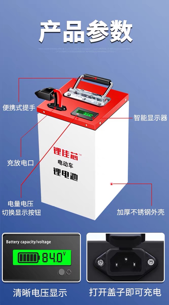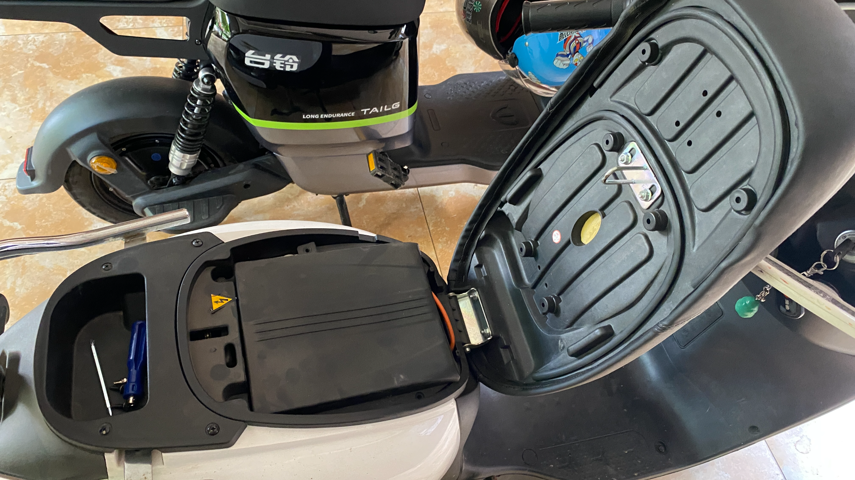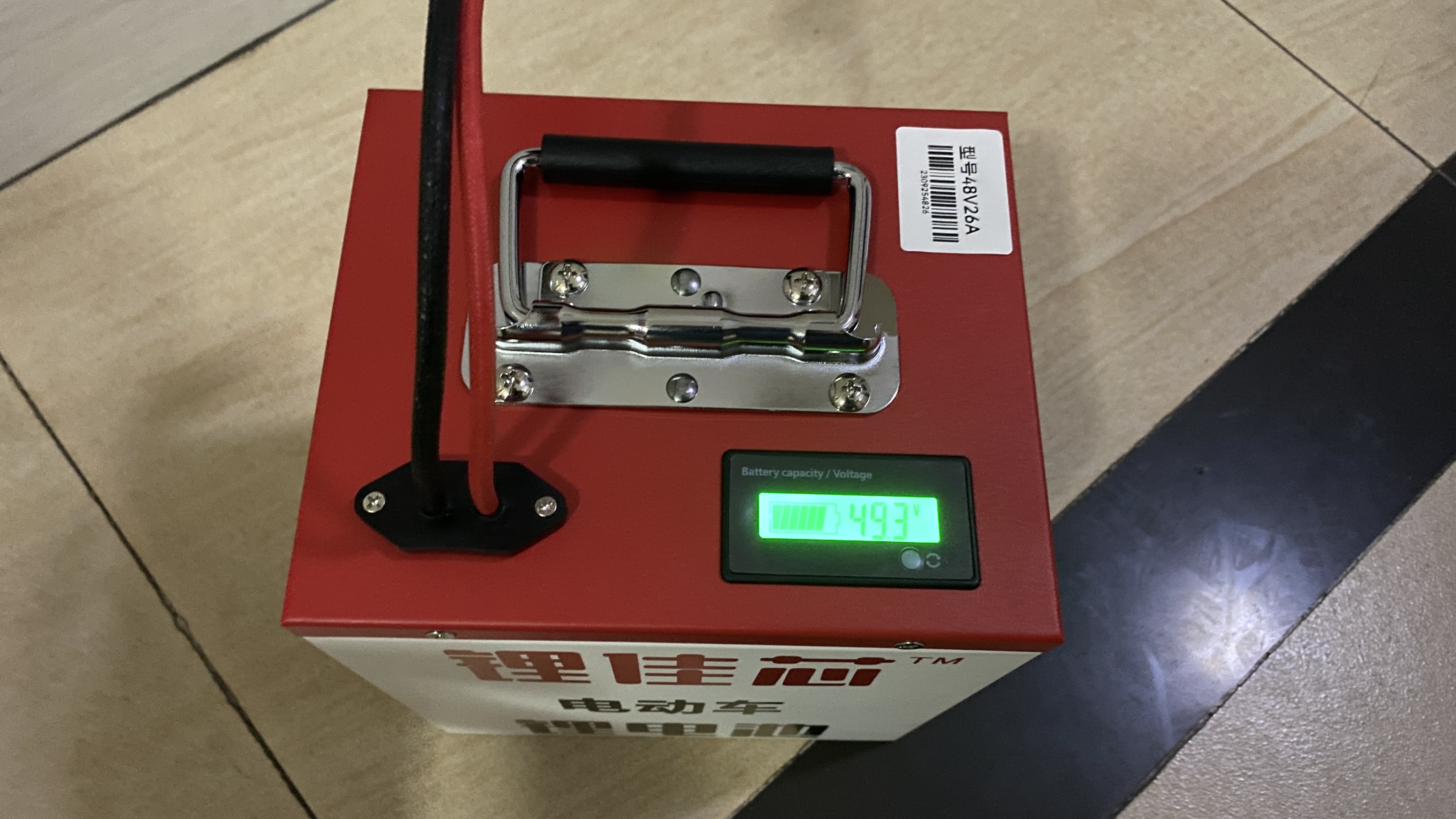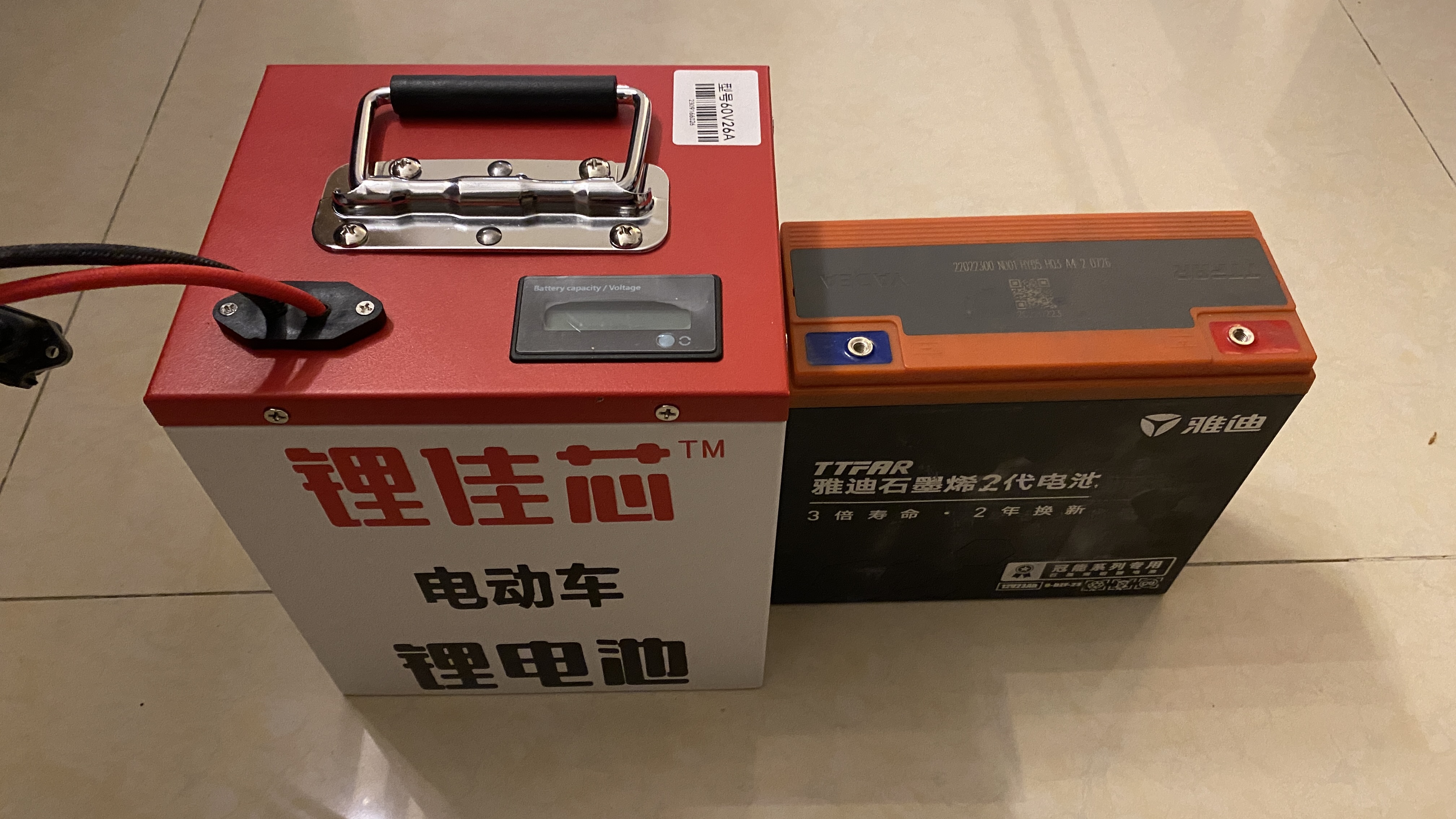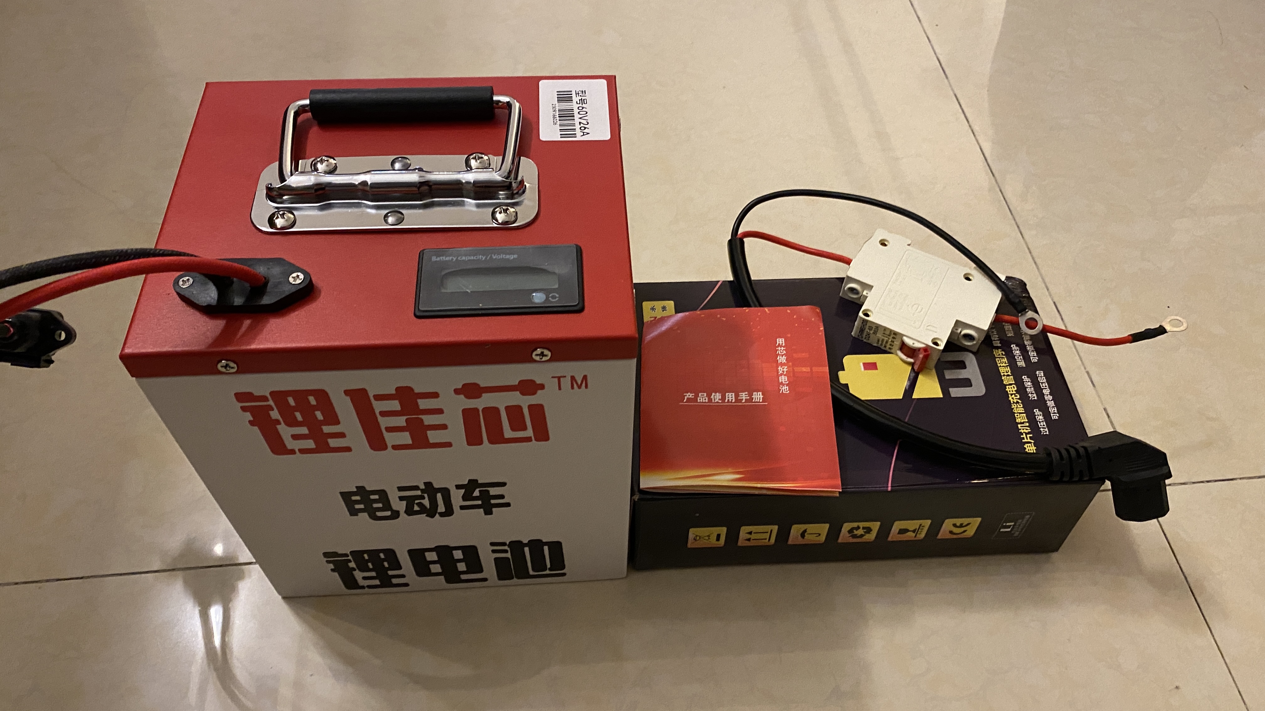 대략 배터리 두개가 들어갈 수 있는 크기의 배터리를 타오바오에서 검색하다가 적당한 크기를 찾아서 구매하였다. 현재 배터리는 48V를 쓰지만, 왠지 배터리가 한개가 더 들어갈 수 있는 공간이 있는 것으로 보아 60V도 지원할 것 같아서 60V짜리 배터리를 구매하였다. 가격은 968위안. 60V에 26Ah의 리튬배터리 크기가 기존 12V 23Ah 3개정도 크기에 무게는 5kg정도 밖에 안된다. 충전기와 새로운 배터리 연결을 위한 스위치도 같이 왔다.