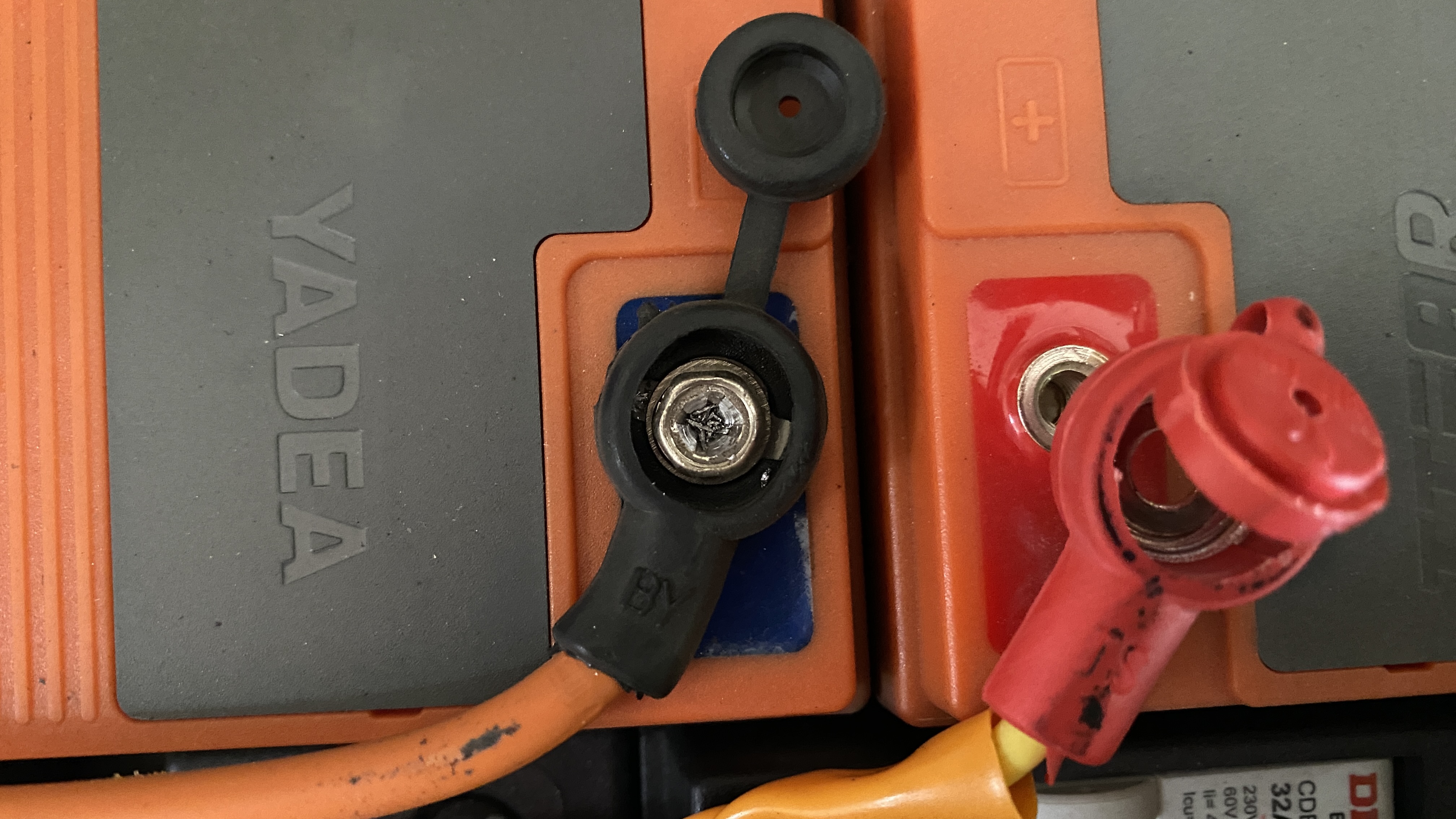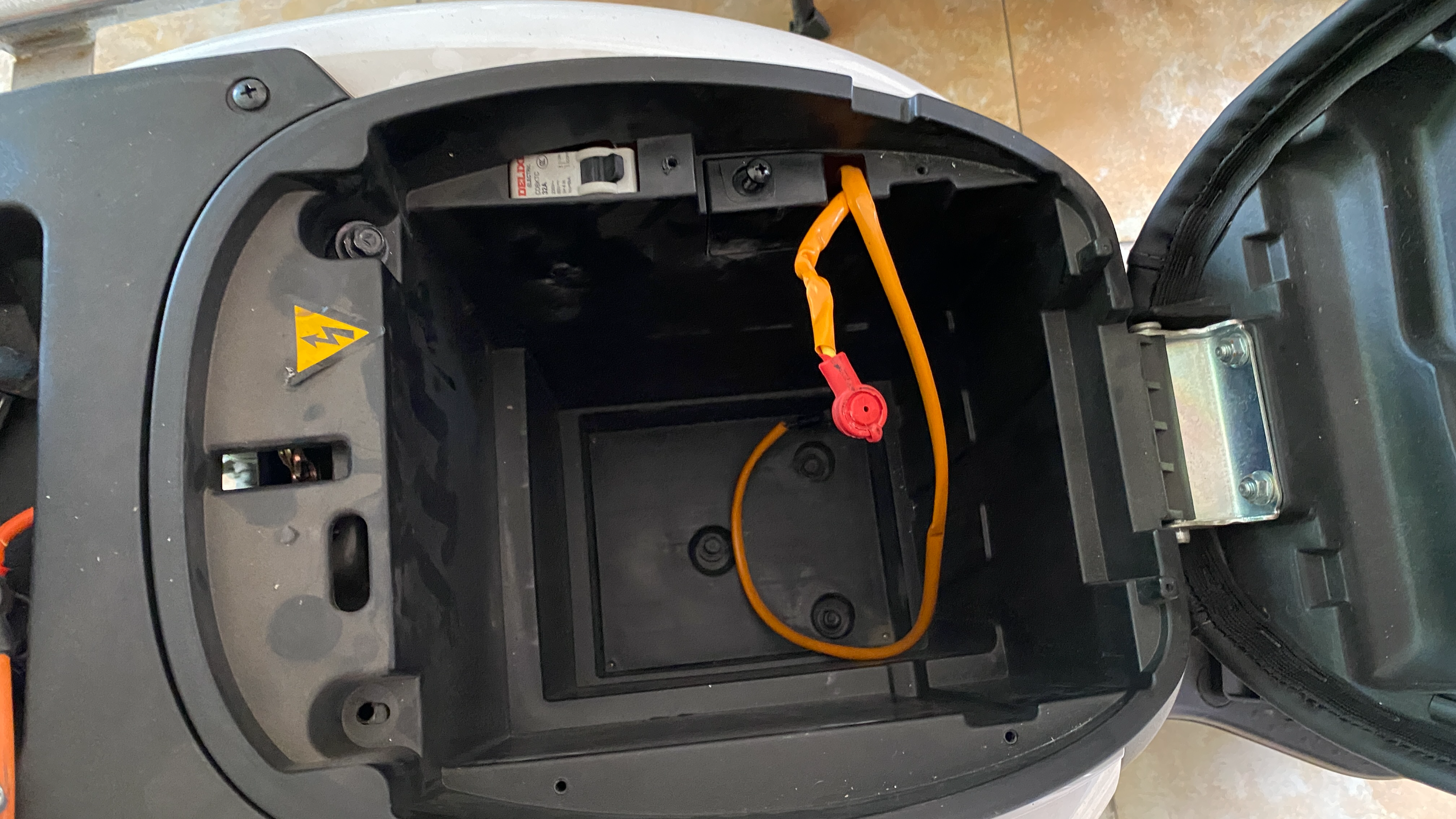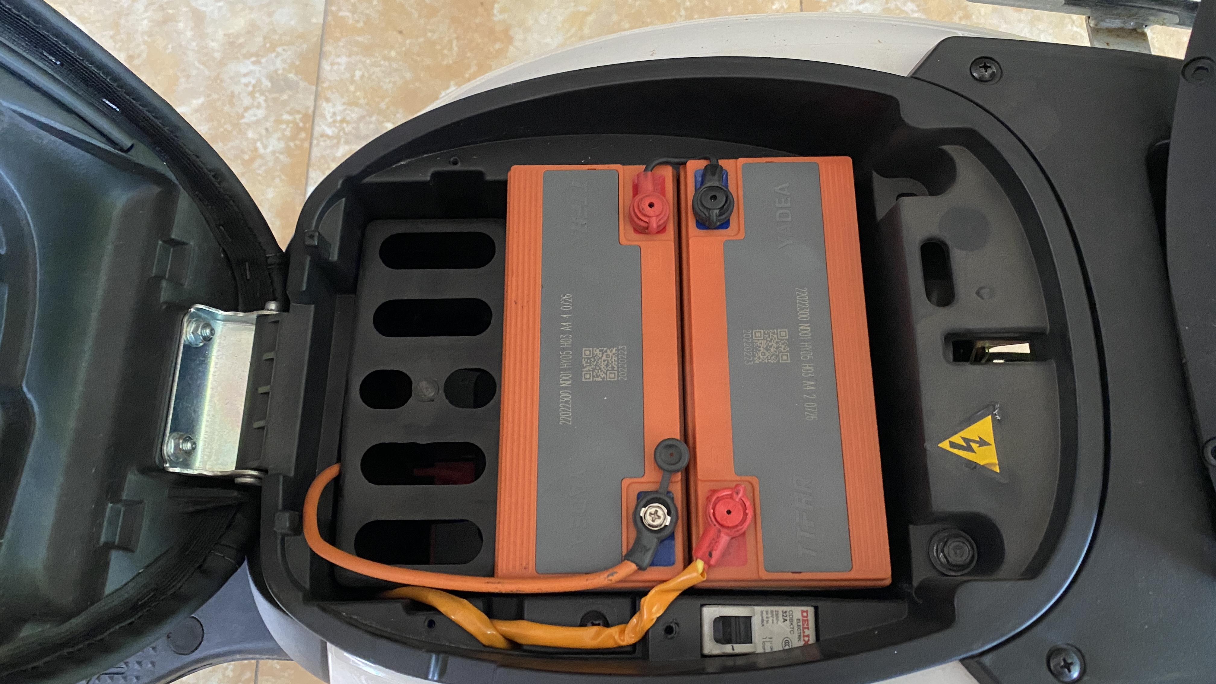 전기스쿠터에 기본으로 사용되는 납전지인 듯 싶다. 위에 12V짜리 배터리가 두개 그리고 밑에 두개가 서로 직렬로 연결되어 48V 출력이 나온다. 납전지의 경우, 메모리효과 때문에 완전방전/완전충전을 하지 않으면 그 용량이 빠르게 준다고 했던 것 같다.