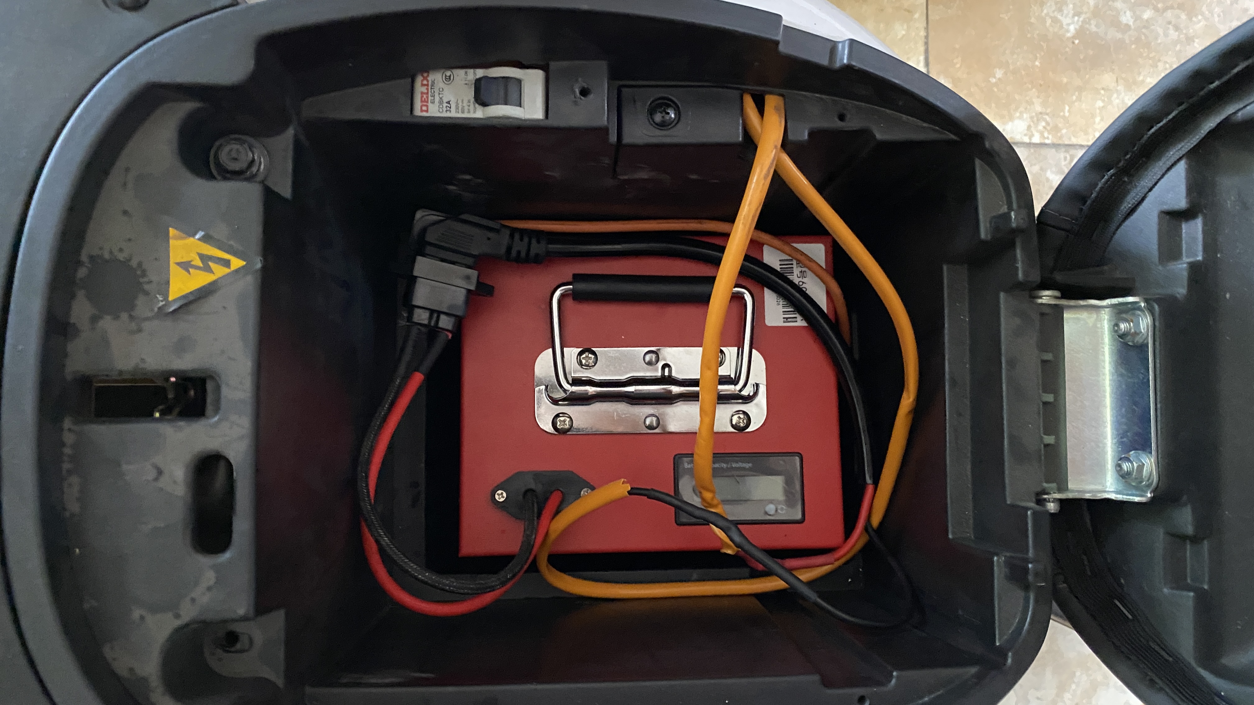 전기스쿠터에 기본으로 사용되는 납전지인 듯 싶다. 위에 12V짜리 배터리가 두개 그리고 밑에 두개가 서로 직렬로 연결되어 48V 출력이 나온다. 납전지의 경우, 메모리효과 때문에 완전방전/완전충전을 하지 않으면 그 용량이 빠르게 준다고 했던 것 같다.