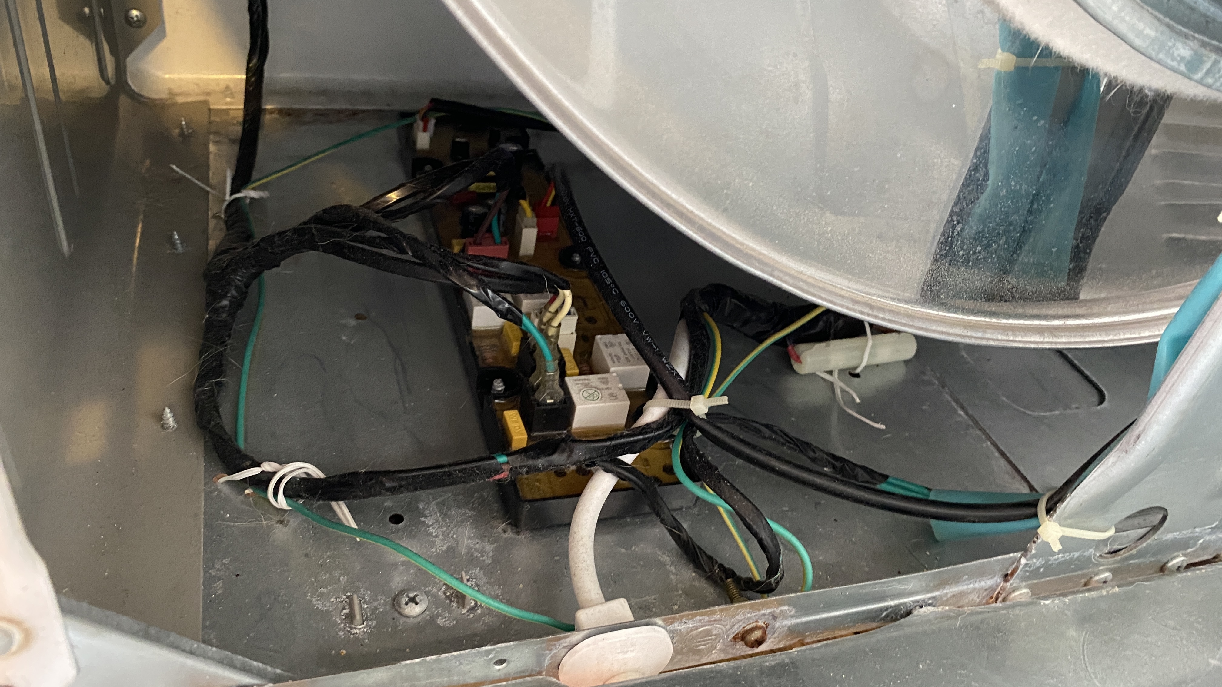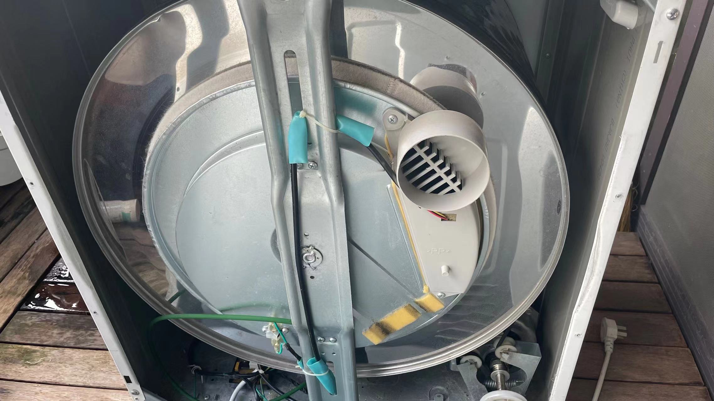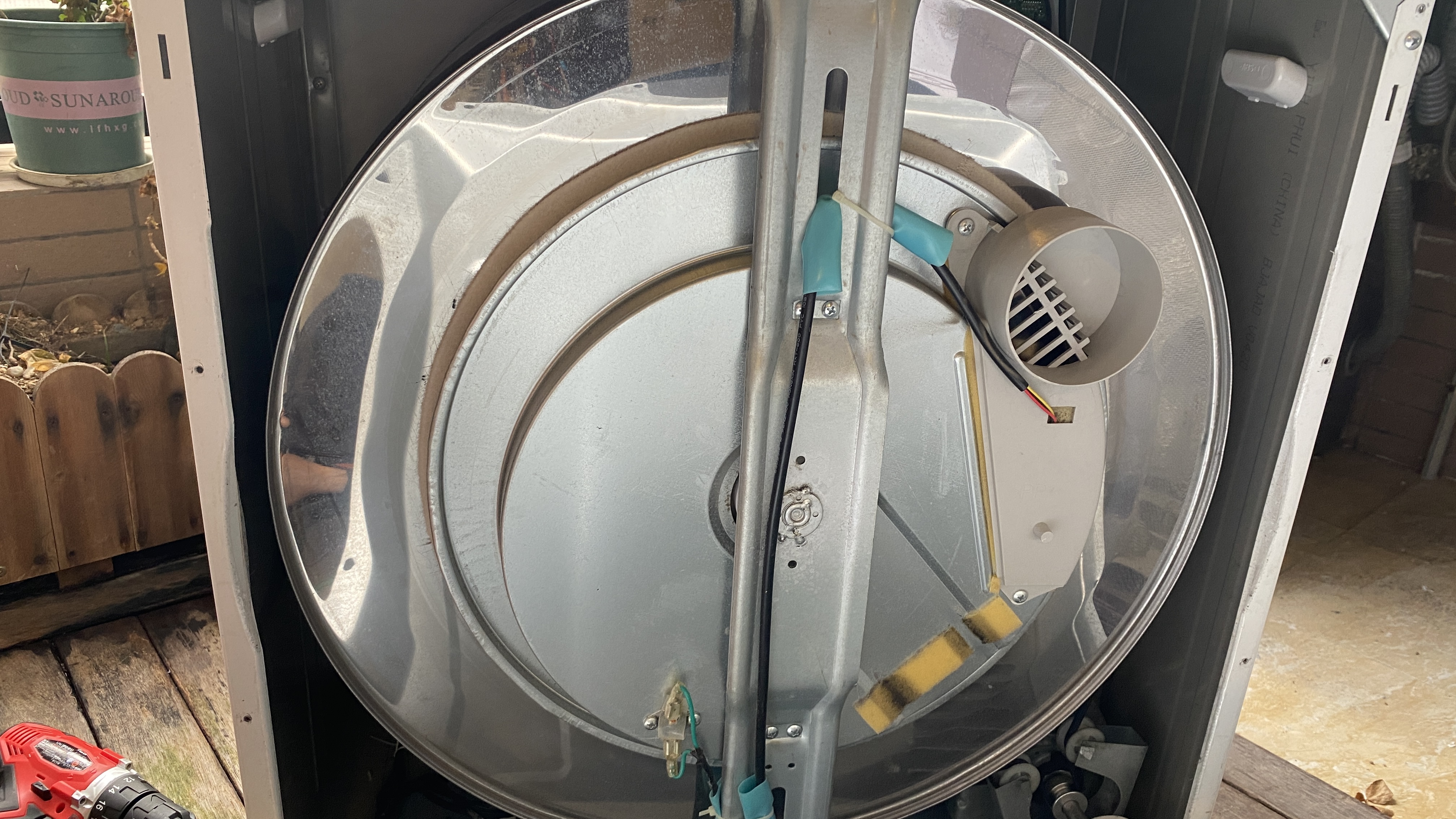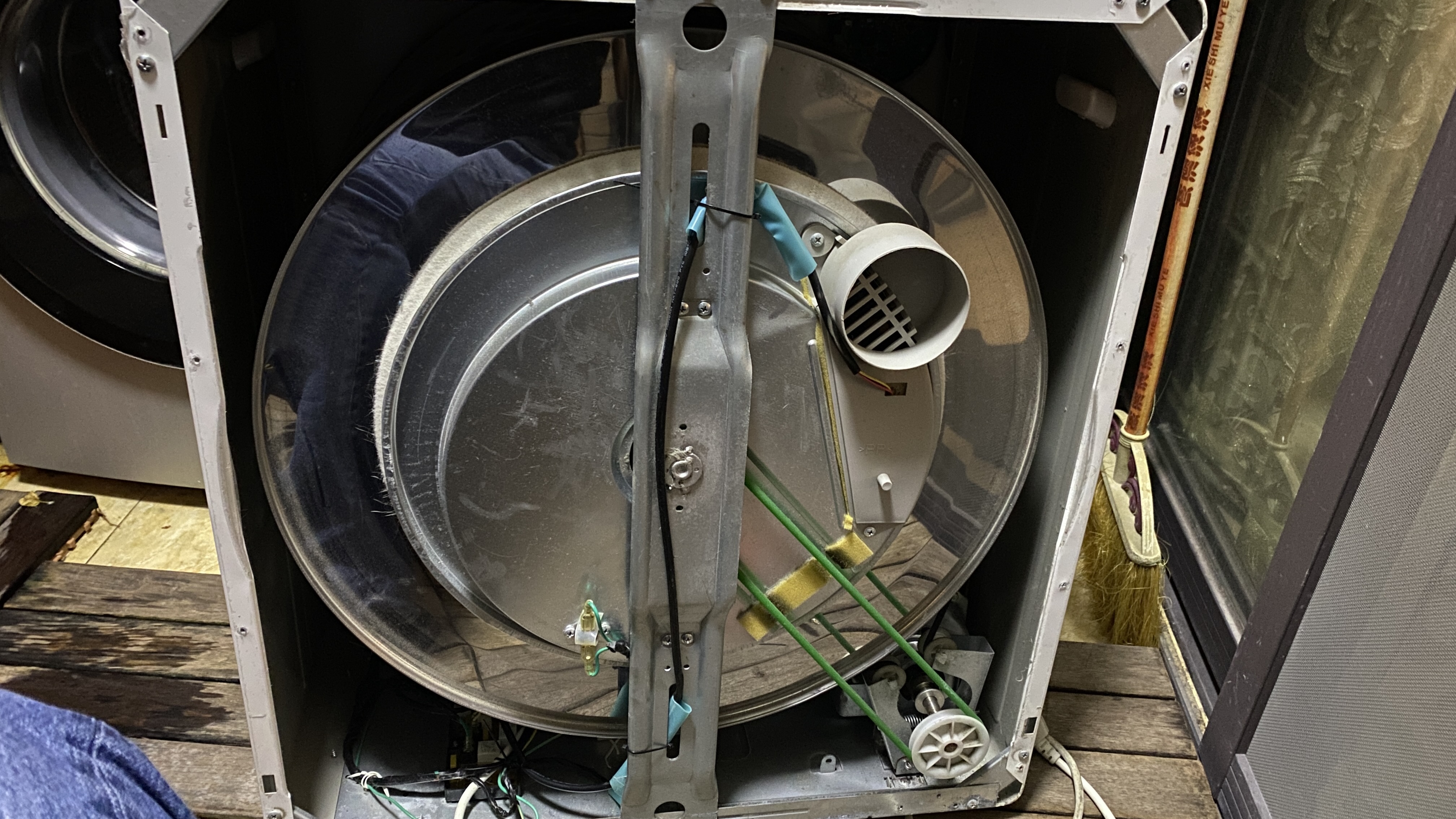제품은 정말 단순하다. 제품의 정중앙에는 빨래를 넣고 돌리는 통과 필터, 그리고 배기구가 있다. 오른쪽 아래에는 모터가 있는데, 이 모터로 통도 돌리고 열풍도 만들어 내는 듯 하다. 하나의 모터에 벨트가 두군데 연결되어 있고 그 중 하나가 끊어진 것. 왼쪽 아래에는 매우 간단해 보이는 기판이 있고 이게 끝.