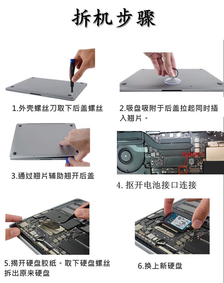 지난번에 배터리를 교체하느라 맥북 프로를 뜯어보았기에 이번에는 훨씬 수월하게 분해할 수 있었다. 게다가 SSD 교체는 배터리와는 다르게 매우 쉽다. 사진을 몇개 찍었는데, 노트북에 옮기고 나서 윈도우에 에러가 나면서 사진이 다 사라져서 그냥 판매자가 올려놓은 이미지로 대체하였다. 나사를 다 풀고 하판을 뜯어내는 작업이 다른 노트북하고 조금 다르고 힘이 좀 들어가야 하는 작업인데, 자세한 것은 유튜브를 찾아보면 잘 설명되어 있는 비디오들을 쉽게 찾을 수 있다.