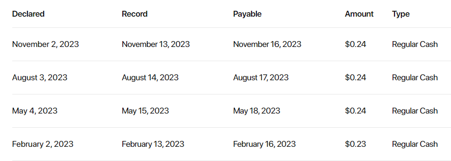 2023년의 마지막 배당인 4분기 애플 주식 배당금이 나왔다 .1년에 분기별로, 즉 4번 배당금을 주는 애플의 2023년 주당 배당액은 $0.23~0.24로 너무 적다..