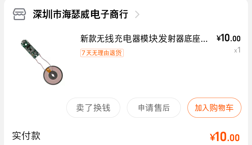 일전에 사두었던 무선 충전파트. 타오바오(淘宝)에서 10위안(1800원)에 구매했었다.