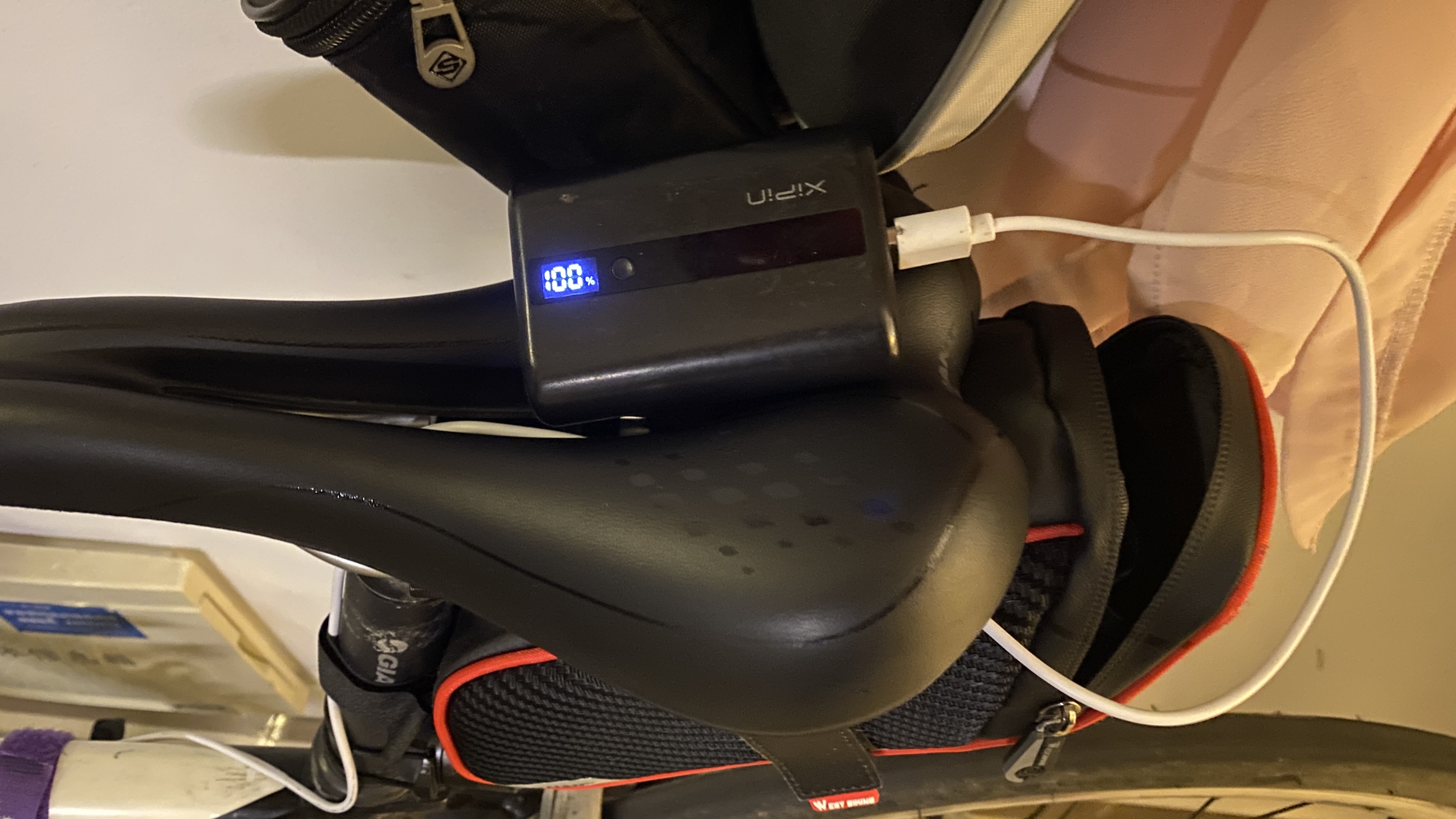 안장 뒤쪽에 작은 휴대용 보조배터리를 넣고 안장 밑으로 전선을 설치하면 깔끔하다.