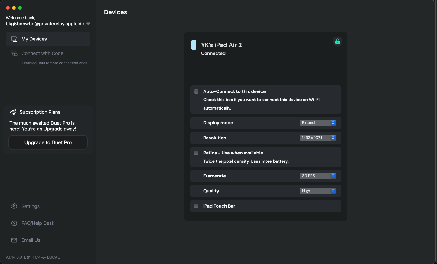 와이파이로 연결하는 기능도 있지만, 이것은 더 비싸고 기존에 구매했던 것은 유선 연결만 된다. 맥북에서 프로그램을 실행하고 아이패드에서도 Duet display 앱을 실행하면 된다. 프로그램이 서로 제대로 인식하면 바로 화면이 나오기 시작하고 간단한 설정을 맥북에서 변경할 수도 있다. 프로그램 사이트에서는 구형 아이패드도 딜레이가 전혀 없다고 하지만, iPad Air2에서도 딜레이는 있다. 그래서 주 모니터로 쓰기에는 부적합하고 보조모니터로로 상대적으로 정적인 화면을 사용하기에는 충분한 듯 하다. 아이패드4를 연결했을 때는 딜레이가 더 심한 것으로 보아 아이패드의 성능에 따라 딜레이가 다른 듯 하다.