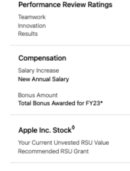 한국회사와 가장 다른점이 있다면, 한국회사는 심각한 업무과실이 있지 않는 이상 연봉이 삭감되는 일이 없지만, 애플의 경우는 인센티브와 RSU가 package에 포함되어 있기 때문에 그해 평가가 좋지 않으면 실질적인 소득이 줄어들 수 있다. 인센티브와 RSU가 package에서 차지하는 비중은 사람과 팀마다 다른데 보통 전체 package에 수십%를 차지한다. 즉 최악의 경우, 인센티브와 RSU를 전혀 받지 못하면 실질적인 수입이 작년대비 훨씬 더 적어질 수 있다는 것이다.