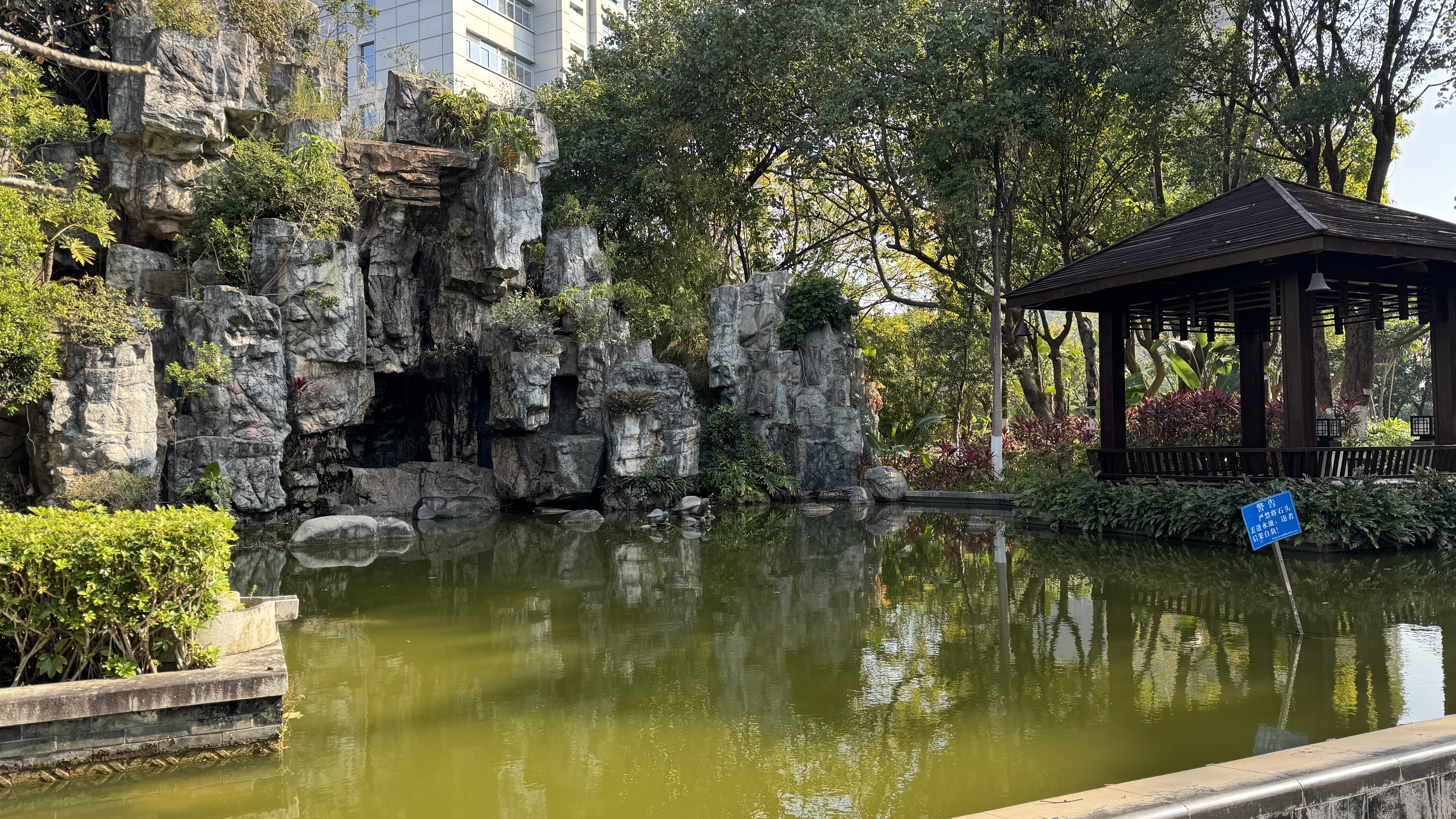 중국 공원에서 흔히 볼 수 있는 연못, 기암 그리고 정자.