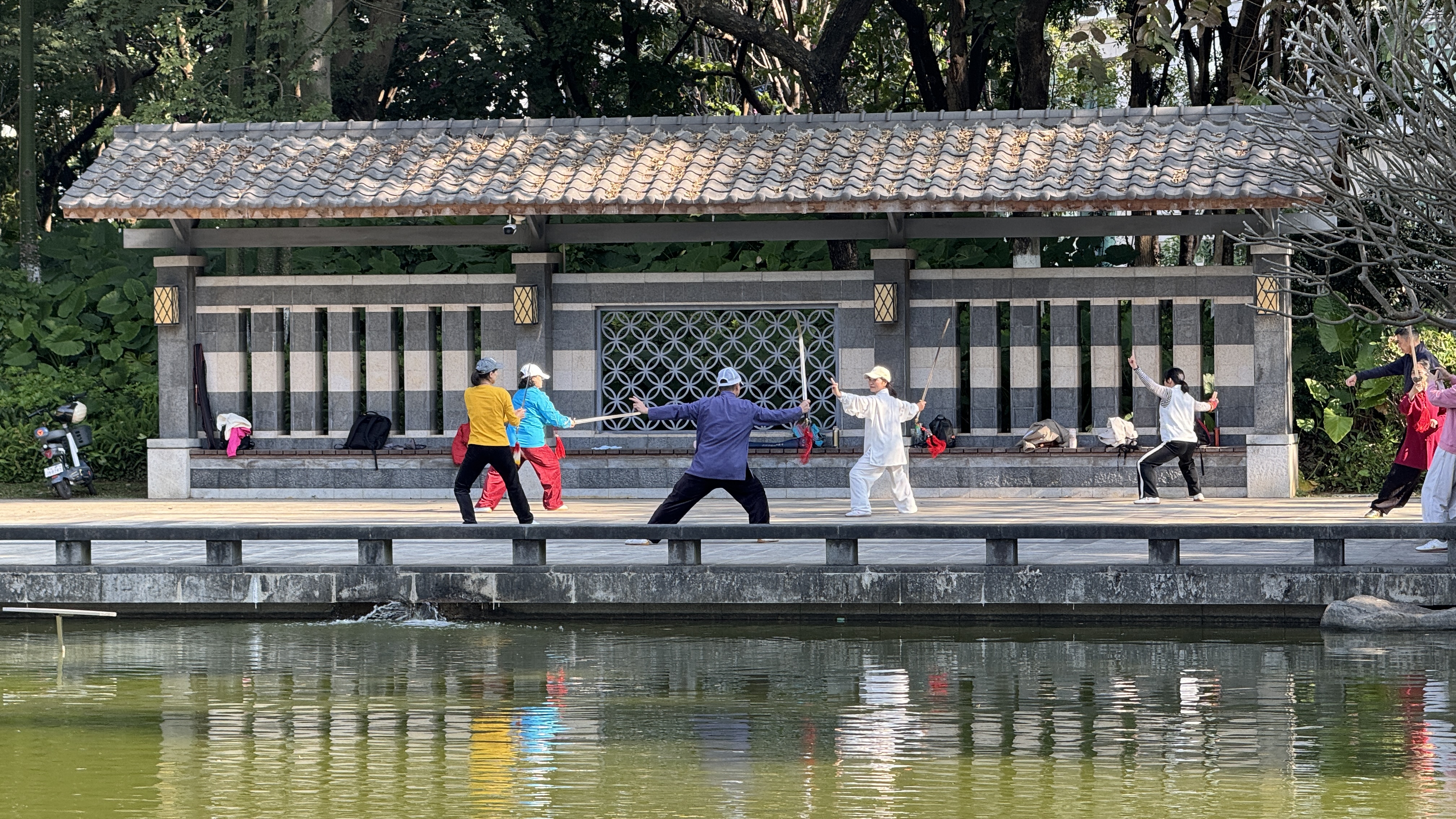 공원 중앙에 있는 연못 건너편에서 검무를 연습하는 사람들을 쳐다보는 YY