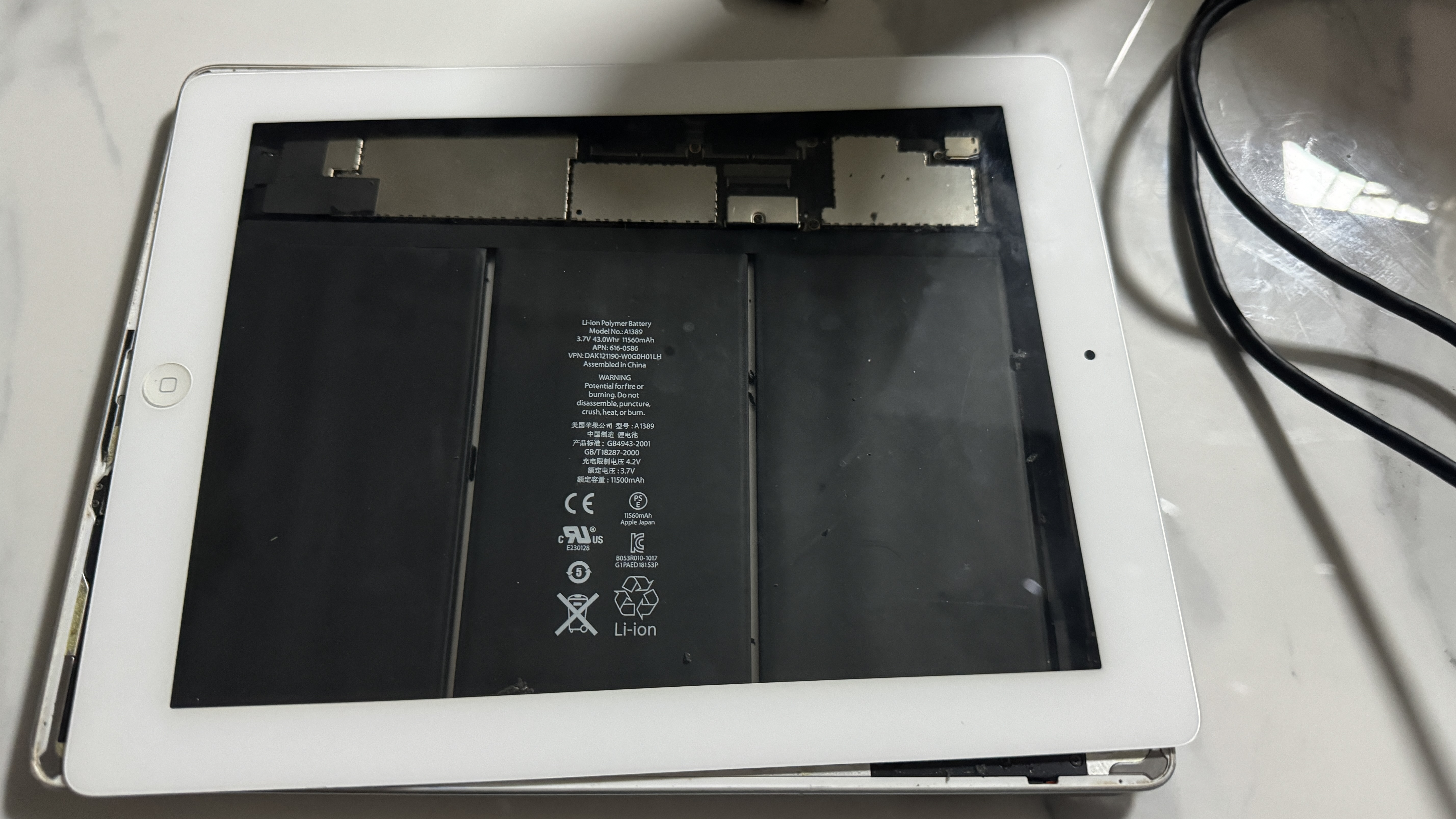 네면을 모두 동일한 방식으로 떼어내어 주는데, 한쪽에 터치스크린과 보드를 연결시켜 주는 케이블이 있으니 이부분을 조심해야 한다. 아이패드의 터치버튼이 밑으로 간 상태에서 왼쪽에 이 케이블이 있다.