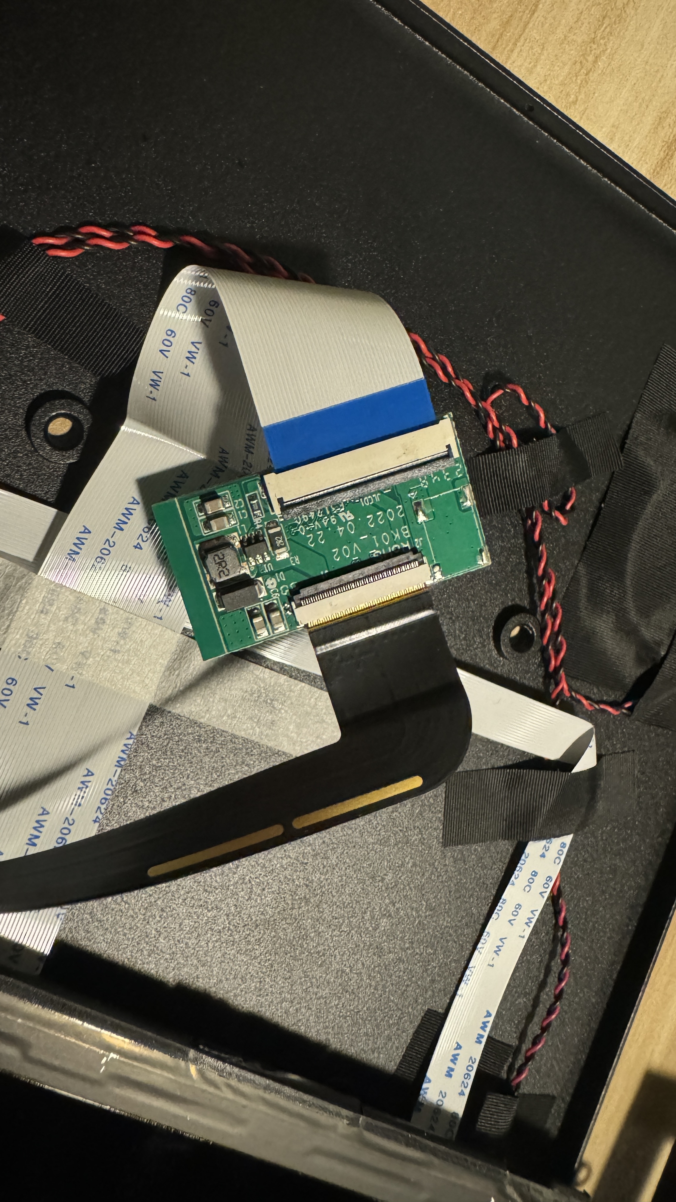 터치스크린 케이블이 있는 면에 디스플레이와 보드를 이어주는 케이블이 있기 때문에 나사를 제거 후, 스크린을 매우 조심히 들어줘야 하는데, 스크린을 들어올리면 케이블이 보드와 ZIF 타입으로 연결되어 있는 것을 볼 수 있다.
