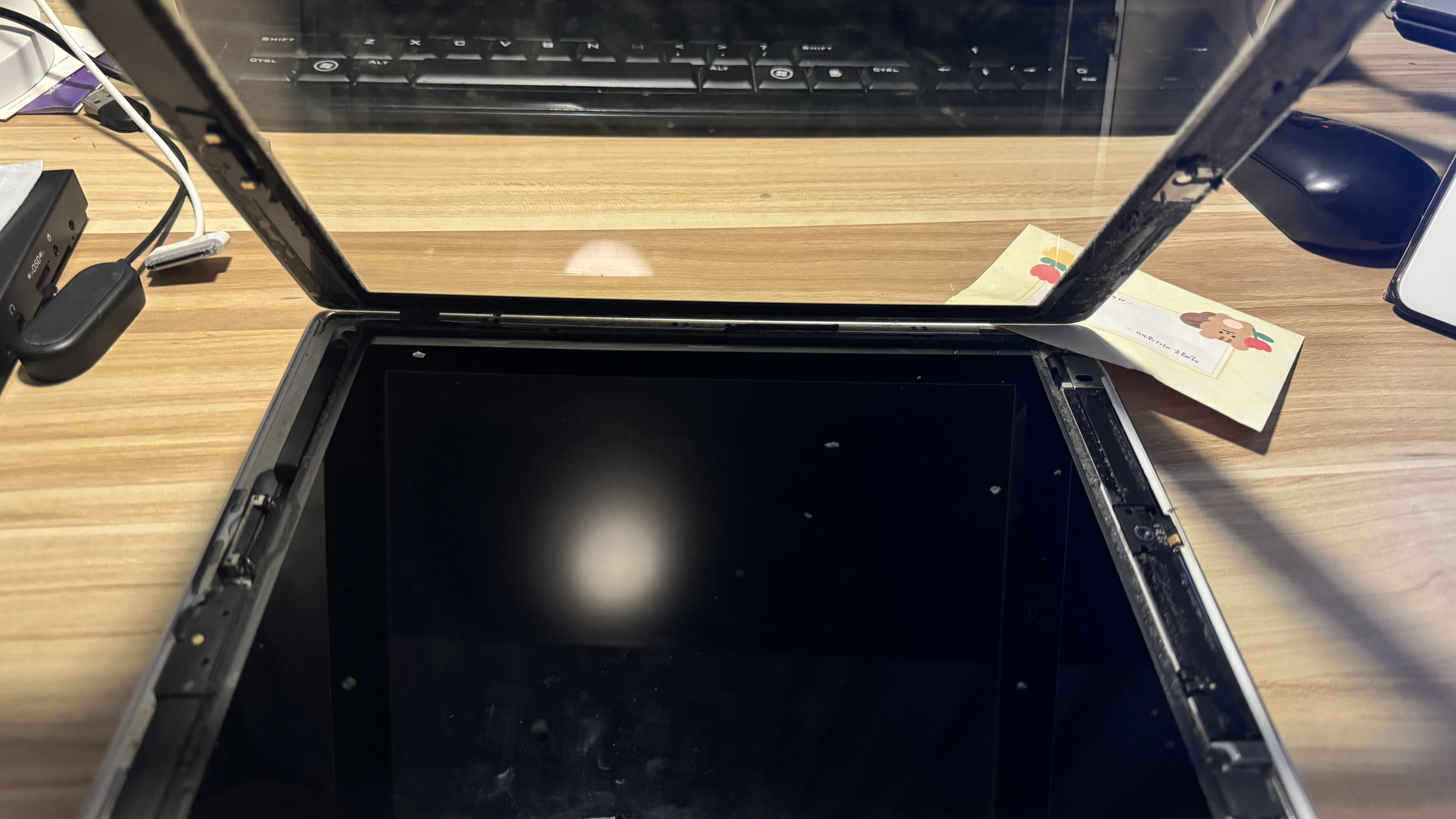 아래 사진에서 왼쪽 위에 있는 검은색이 터치스크린의 케이블. 이 터치스크린을 떼어내면 네모퉁이에 있는 네개의 나사를 풀어준다.