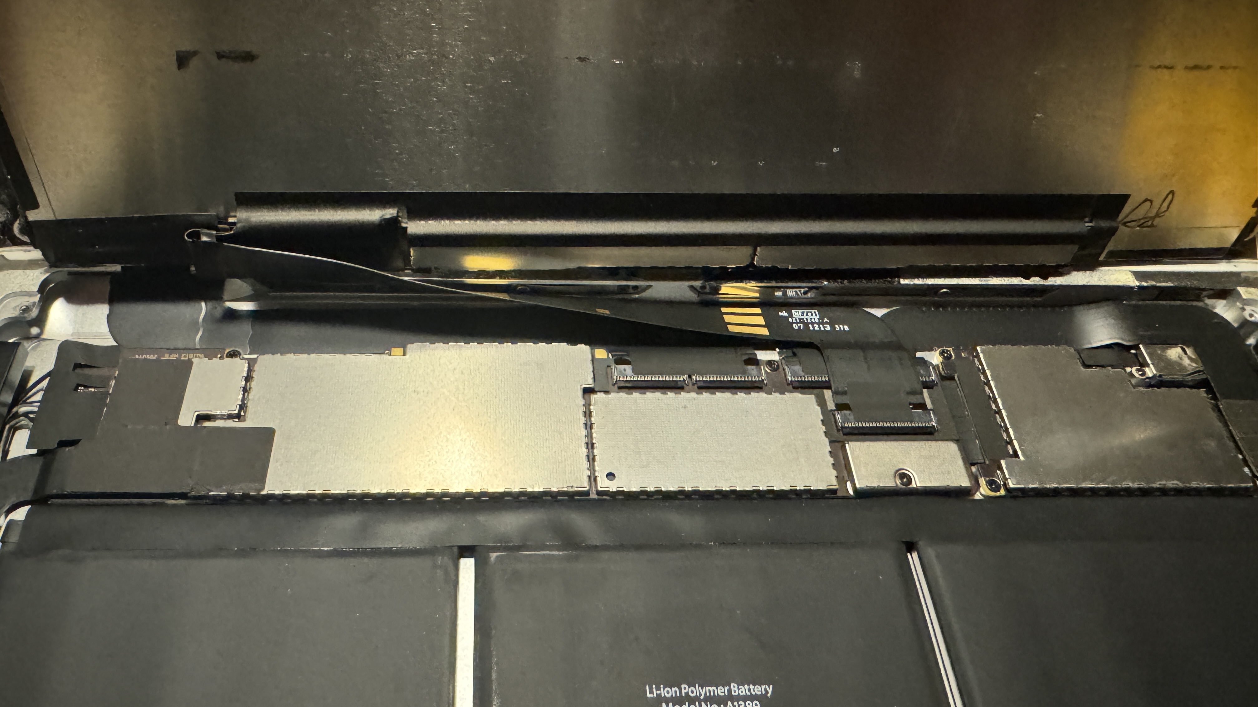 네면을 모두 동일한 방식으로 떼어내어 주는데, 한쪽에 터치스크린과 보드를 연결시켜 주는 케이블이 있으니 이부분을 조심해야 한다. 아이패드의 터치버튼이 밑으로 간 상태에서 왼쪽에 이 케이블이 있다.
