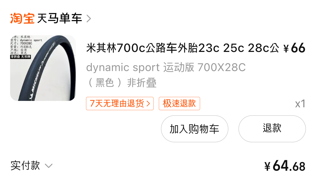차가 들어올 수 있는 공원 입구로 다시 걸어나와서 택시를 불러 자전거를 겨우겨우 싣고 집으로 돌아와, 타이어만 온라인에서 구매 후 자이언트 매장에 가서 타이어와 튜브 교체를 부탁하였다. 지난번에 타이어는 자이언트 벌크 타이어였는데, 이번에는 미쉐린 벌크 타이어로 가격은 65위안 (대략 12,000원), 튜브 교체 및 공임비는 40위안 (대략 8,000원)으로 총 2만원의 비용이 들었다.