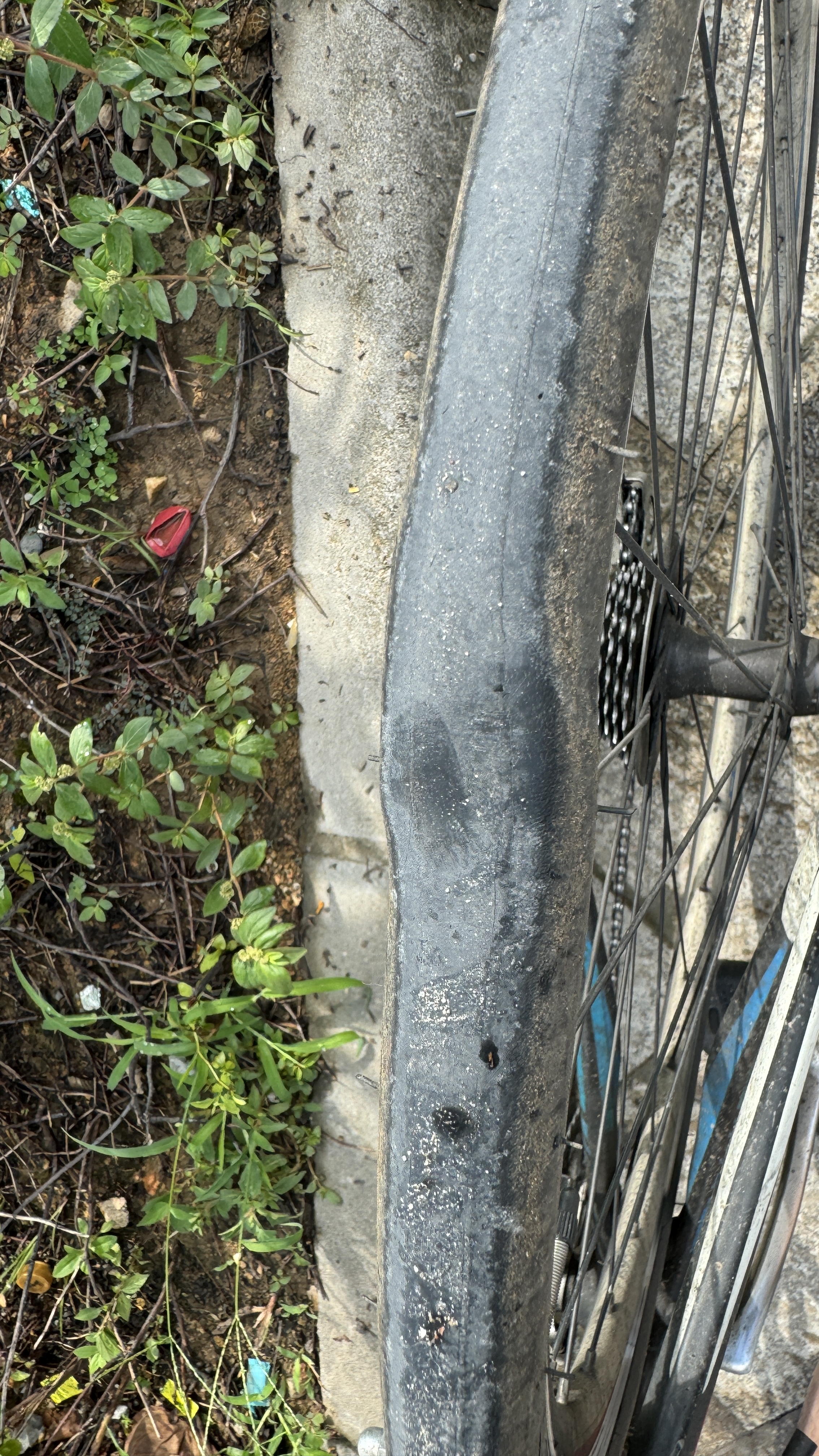 하지만 대략 11km정도쯤 갔을 때, 뭔가 타이어 사이에 낀 듯한 느낌이 들기 시작하였다. 바퀴가 돌아갈 때 주기적으로 퉁퉁 튀는 느낌이 들어서 조금 더 가다가 자전거를 멈춰 세운 후 자전거 뒷타이어를 확인해 보았다. 그러자 뒷 바퀴 타이어의 한 부분이 볼록하게 튀어나와 있는게 아닌가. 타이어에 압력이 조금 더 가해진다면 금방이라고 터질 듯 한 모양새였다. 왠지 타이어 안쪽에 있는 튜브의 한부분에 어떤 이유에서인지 큰 압력이 가해져서 튜브가 상하여 그 부분이 비정상적으로 부풀어오른 듯 보였다. 이대로 가다간 언제 타이어가 터질지 몰라 라이딩은 포기하고 결국 집으로 귀가.