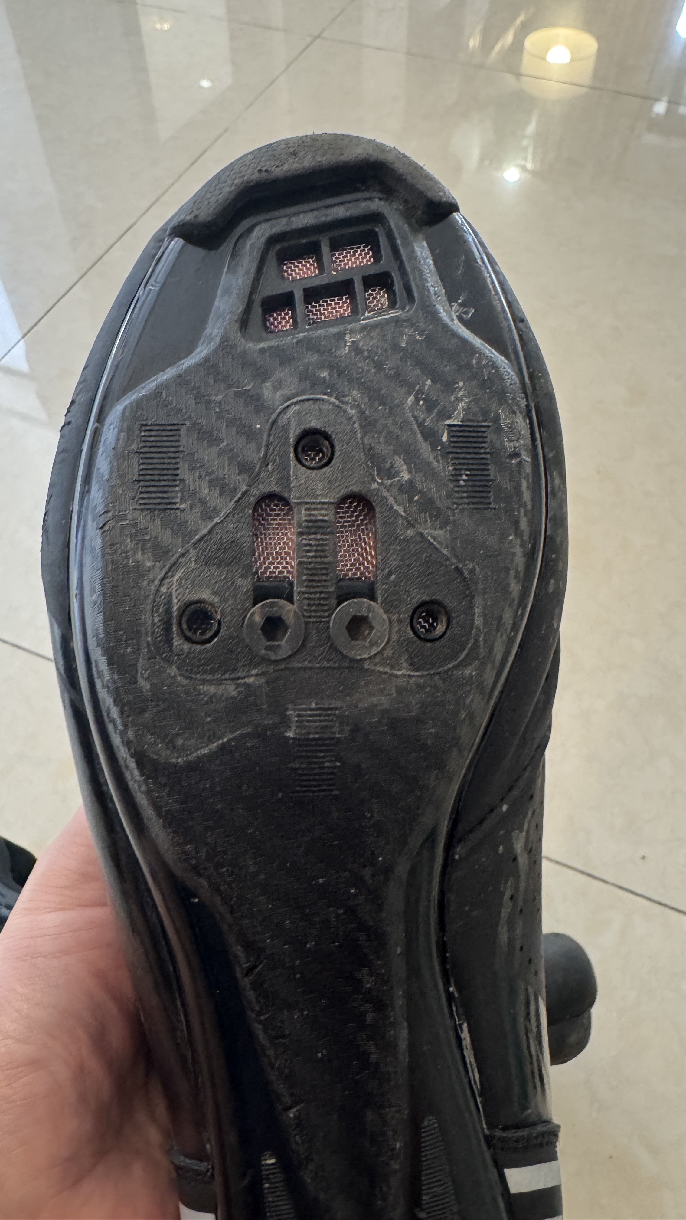 클릿슈즈에서 클릿을 빼고 나면 왼쪽사진같이 보이는데, 클릿의 모양과 규격은 통일된 듯 하다. 그래서 브랜드 상관없이 저렴한 것으로 구매...