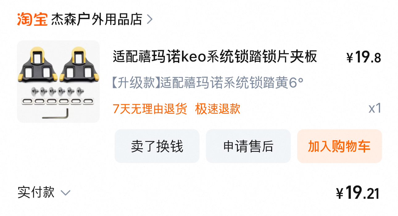 1년 반정도 신었던 클릿슈즈가 언제가부터 패달에 잘 걸리지 않고 빠져서 클릿을 교체하였다. 클릿은 소모품이라 플라스틱 부분이 닳아 없어지거나 깨지면 교체해야 한다고 들어서 타오바오(淘宝)에서 19위안(3,800원)에 클릿을 구매하였다.