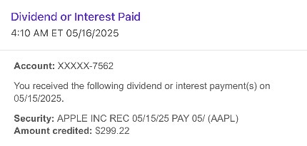 애플 주식의 2025년 2분기 배당이 들어왔다. 최근 미국 트럼프 대통령의 관세 헛발질 때문에 마구 떨어진 주식 가격으로 인해 이제 배당 금액으로 1주 이상 구매할 수 있게 되었다
