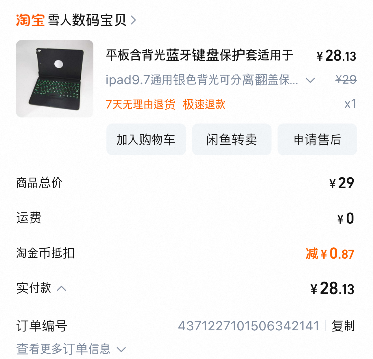 집에서 업무를 하는 모습을 보게 되면 아이가 자기도 타자를 치고 싶어해서 아이 장난감 겸 아이패드는 항상 VPN에 연결되어 있어 간단하게 작성할게 있을 때 편하게 쓸 수 있을 것 같아 아이패드 케이스 + 키보드를 구매하였다. 키보드만 있는 게 아니라 케이스와 같이 있어서 마치 아이패드를 맥북처럼 쓸 수 있게끔 만들어주는 케이스이다. 아이패드 에어 2도 이제는 워낙 구형이 되어 가격도 29위안으로 한화로는 5,500원밖에 안될 정도로 저렴하다.
