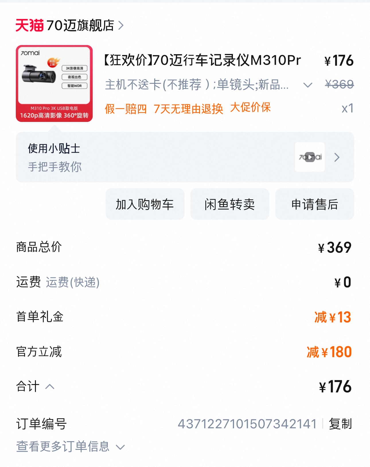 후방 블랙박스용 카메라를 구매해서 설치해 보았다. 주차용 카메라는 트렁크 문 외부에 달려 있지만 비디오 저장도 안되고 전진 주행 중에는 아예 작동을 하지 않기에 후방용으로 저렴한 카메라를 구매해서 설치해 보기로 한 것이다. 중국 인터넷 쇼핑몰 타오바오(淘宝)에서 176위안 (한화 33,000원)짜리를 구매하였다.