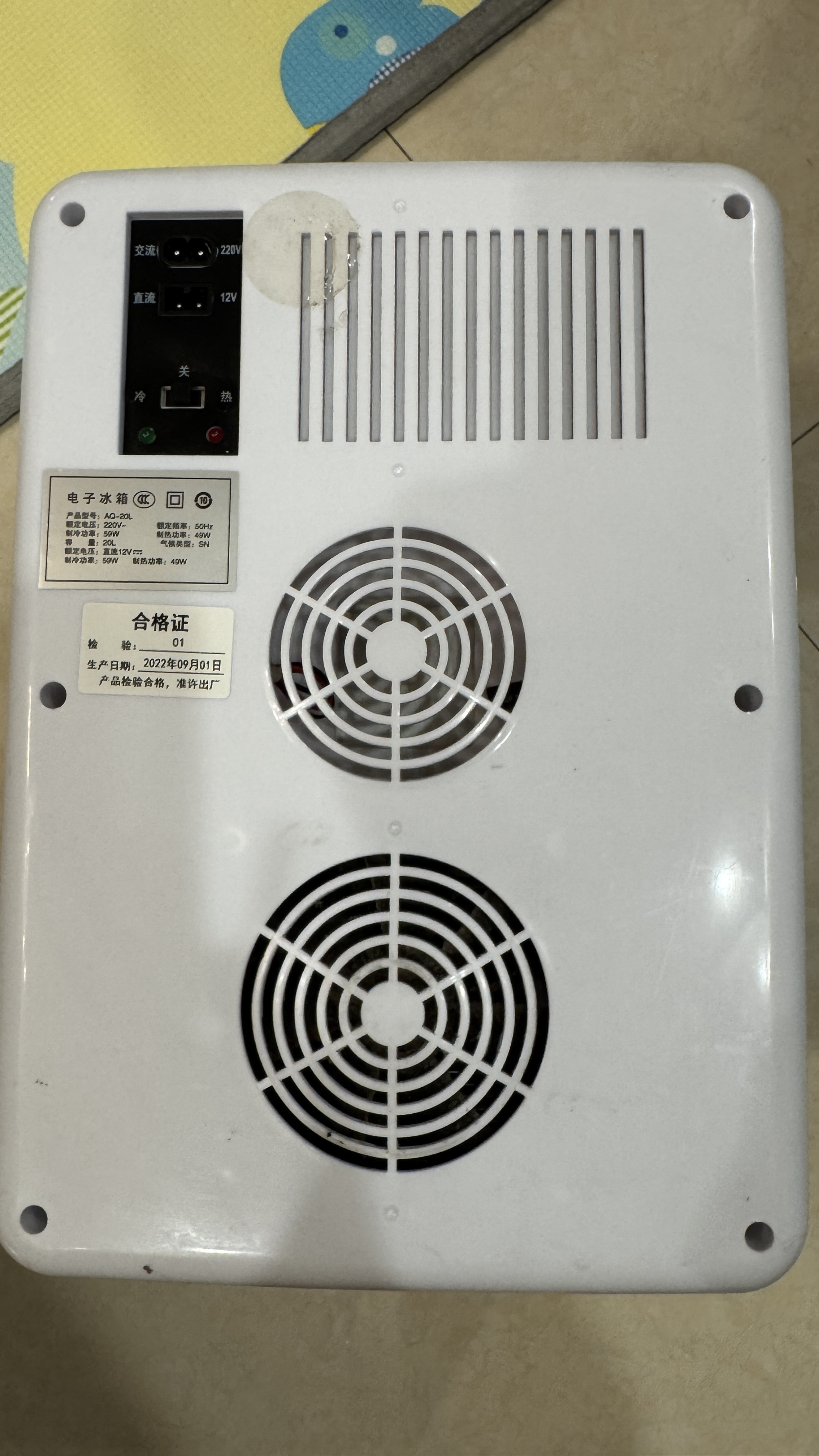 3년전쯤 강아지 사료용으로 사용하던 소형 열전소자 냉장고가 어느날 작동하고 있지 않다는 것을 알게 되었다. 우선 냉장고 내부가 따뜻해져있었으며 냉장고 뒤에 있는 냉각용 팬이 돌아가지 않는 것이었다. 저렴하게 구매한 것이라 버리고 다시 살까 생각하다가 왠지 간단한 고장일 것 같아서 뜯어 보기로 하였다. 가정용 220V와 차량용 12V를 겸용으로 사용할 수 있는 냉장고이다. 열전소자의 특정 덕분에 냉장고와 더불어 온장고의 역할도 할 수 있다.