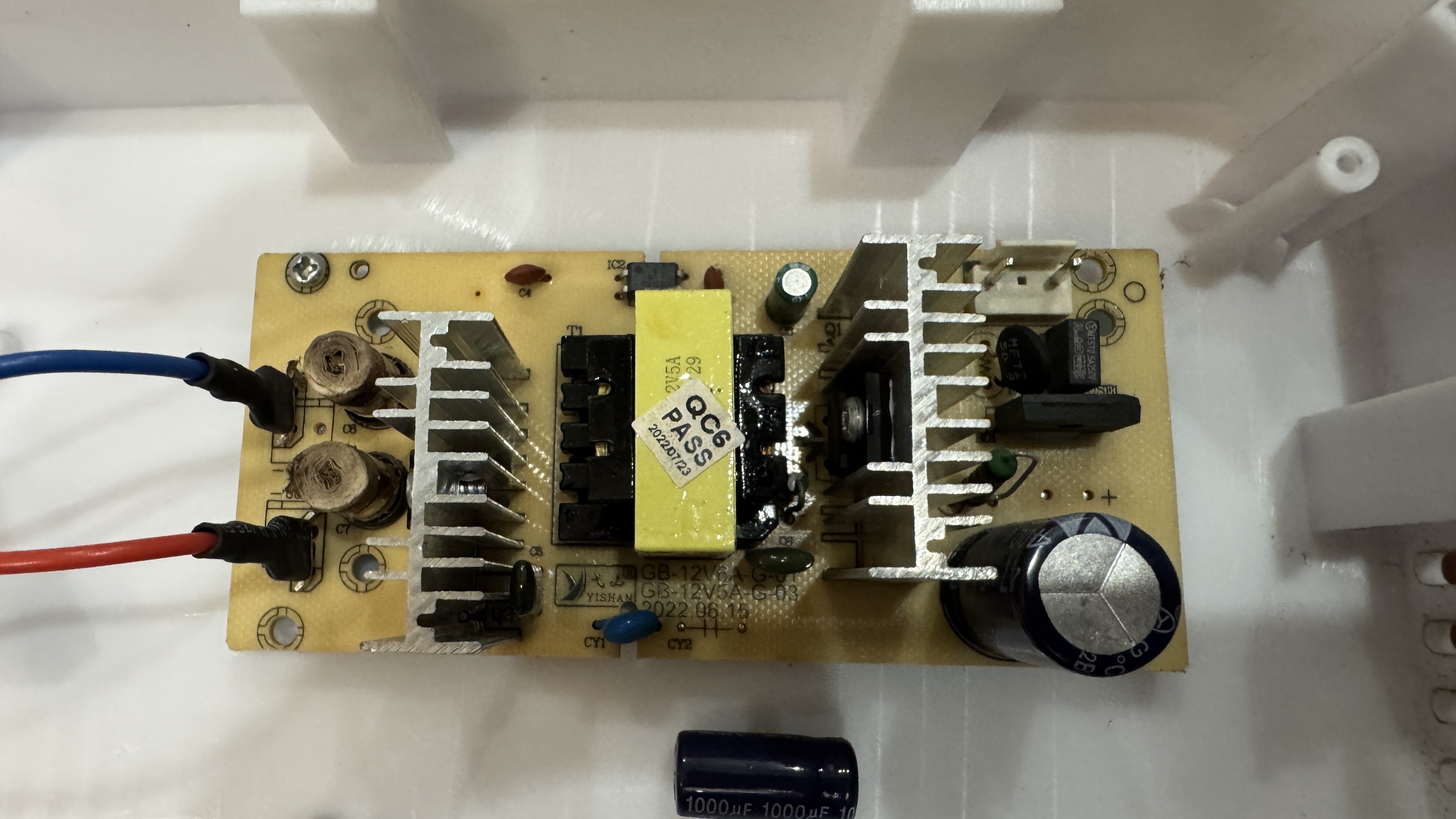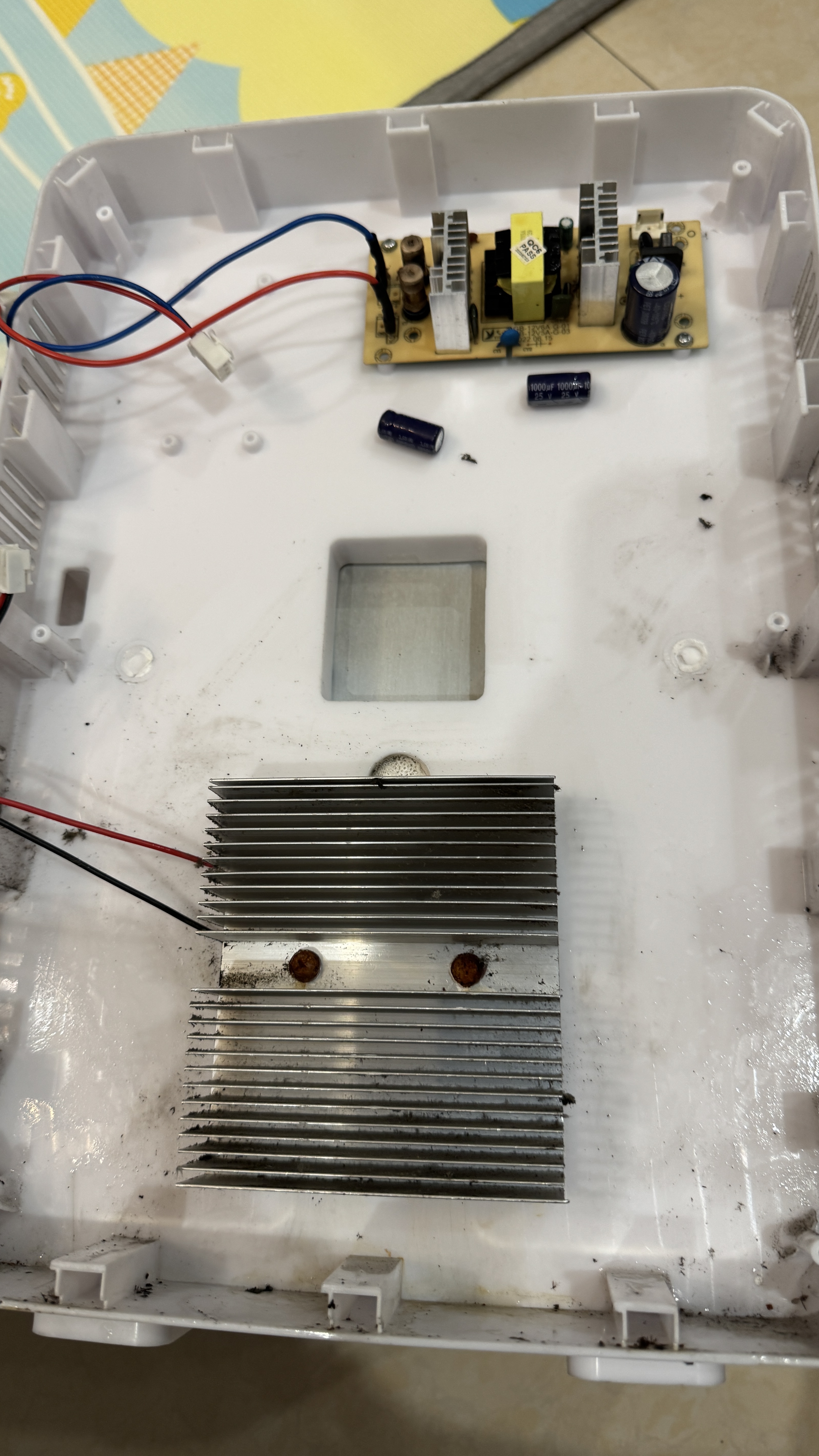 전력을 받아서 변압 후 열전소자와 냉각팬에 분배해주는 인버터 보드인데, 왼쪽에 있는 캐패시터 두개가 박살이 나 있는 것을 볼 수 있다.