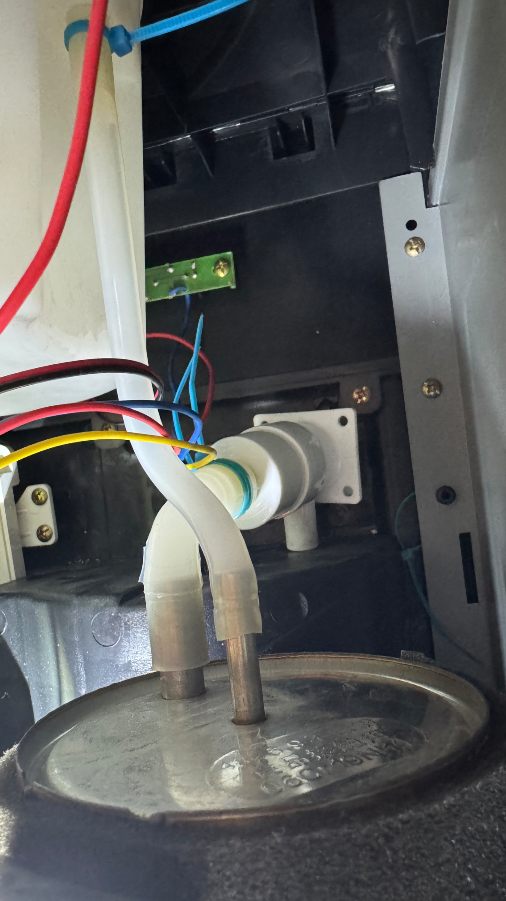 정수기의 뒷면 뚜껑을 제거한 모습, 위쪽은 생수통의 물이 내려오는 곳이고 왼쪽은 냉수, 오른쪽은 온수를 준비하는 곳이다.