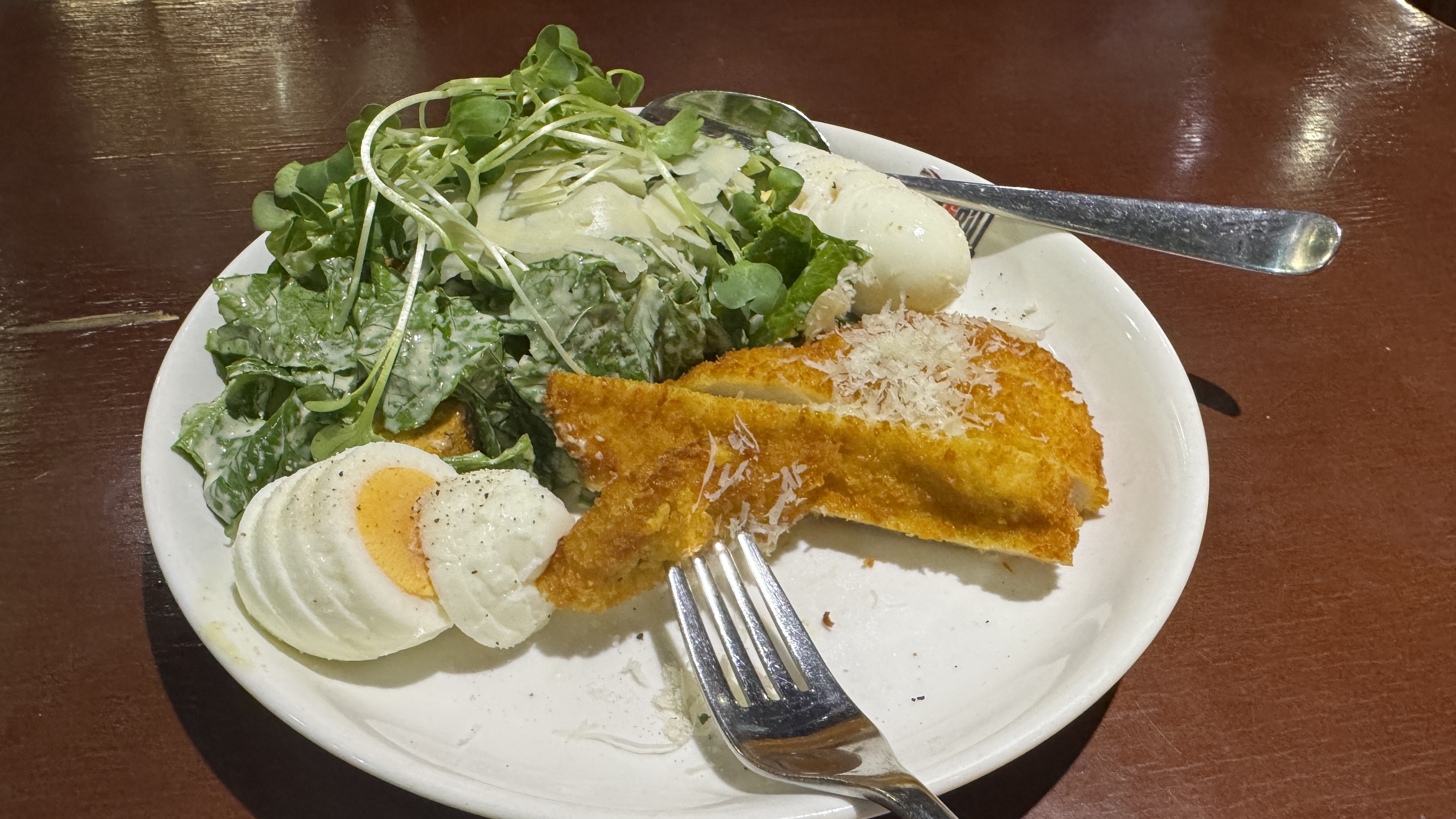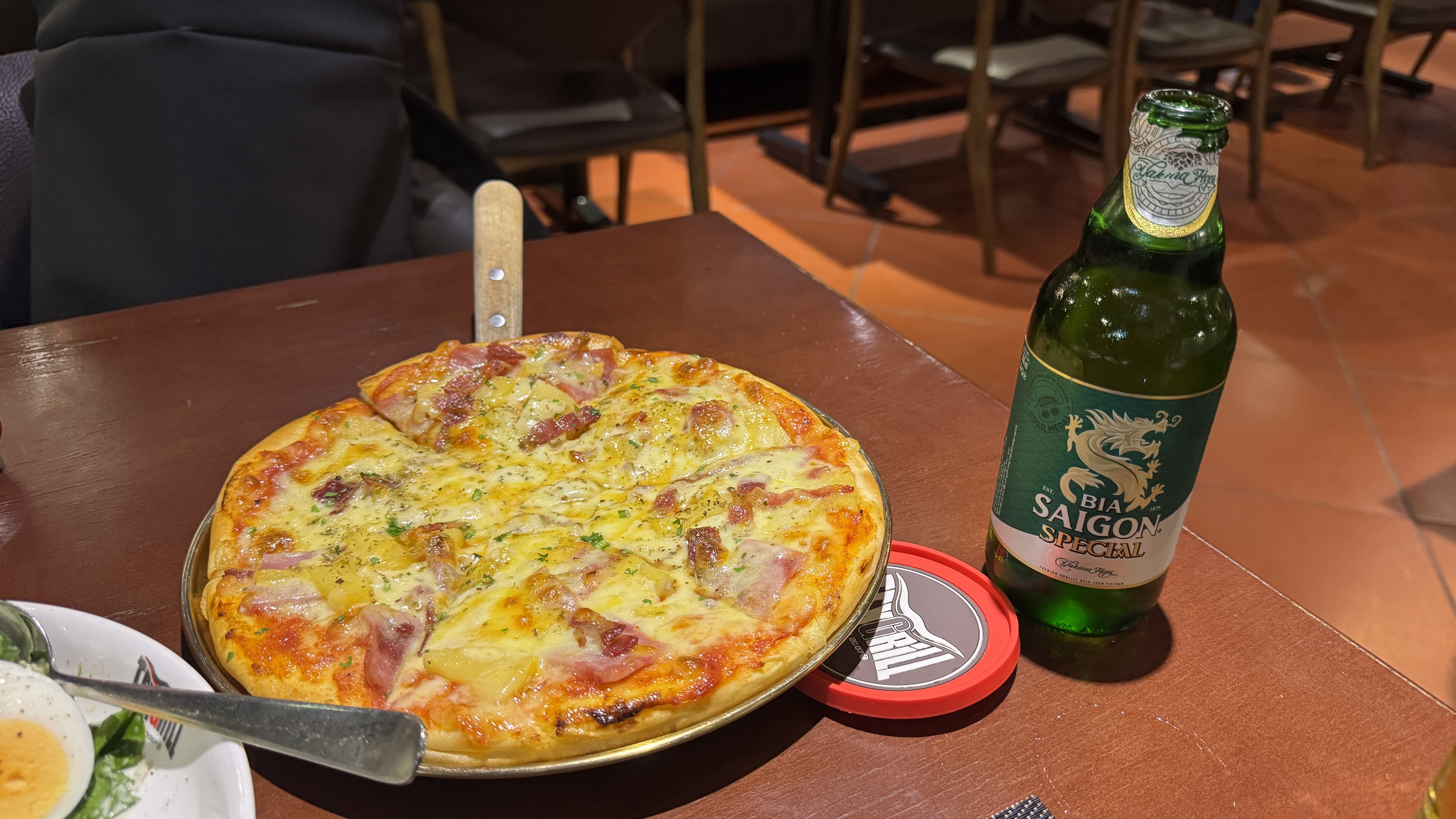호텔 근처의 식당에서 혼자 먹는 저녁. 너무 배불러서 결국 피자는 남겼다.