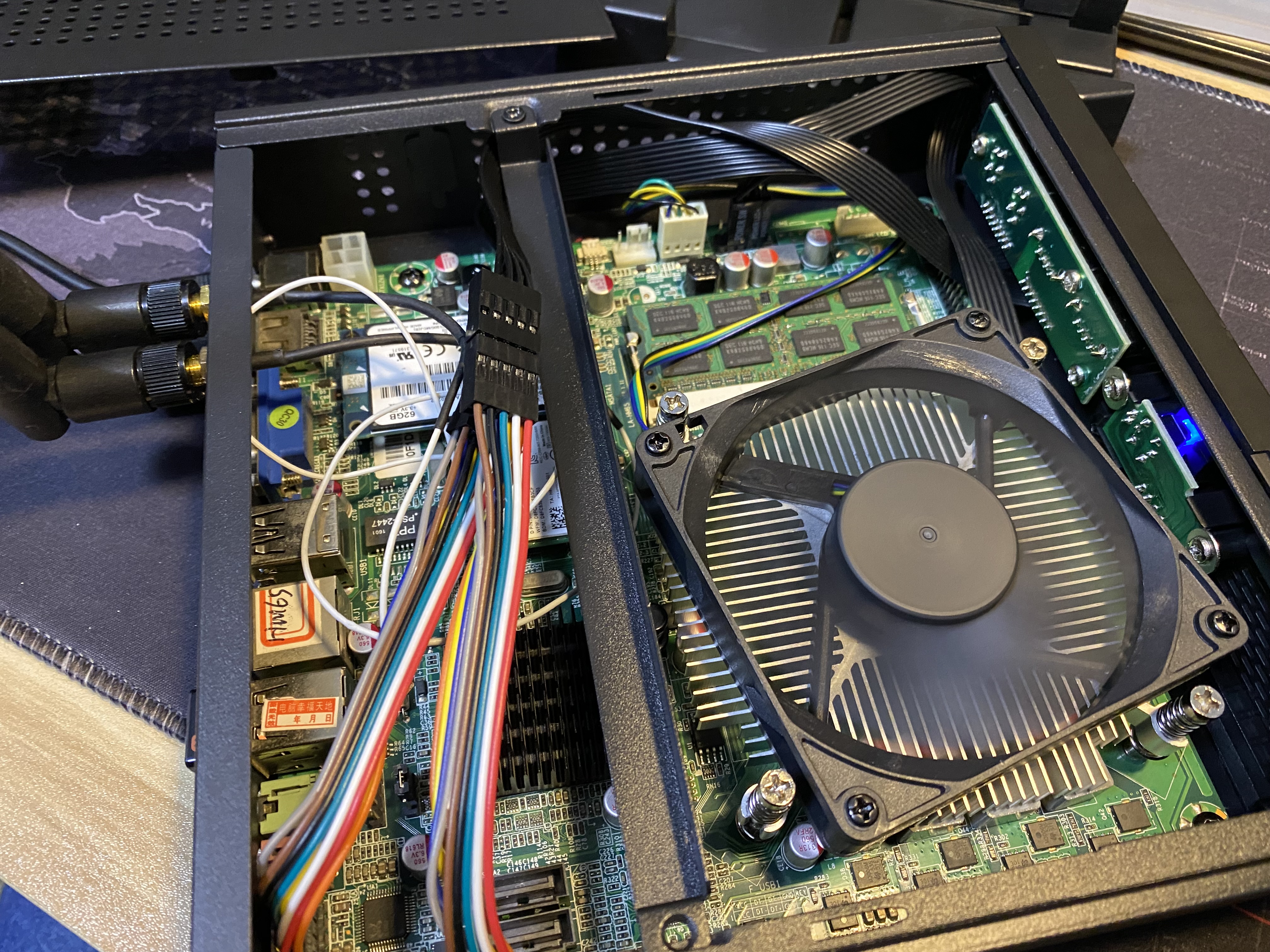 조립을 하다보니 케이스와 이 메인보드가 살짝 맞지 않는 구석이 있다. 우선 메인보드의 SATA 커넥터와 케이스의 SSD/HDD를 고정하는 곳이 동일하다보니 추가 HDD/SSD를 제 위치에는 설치할 수 없다. 또한 CPU fan의 방열판이 CPU옆에 있는 캐패시터와 딱 닿는다. 이게 CPU fan이 더 내려가야 하는데 이 캐패시터 때문에 내려가지 못하는 것인지 구분도 되지 않는다. 케이스가 매우 작다보니 연결선을 이용해야 했던 Audio와 USB케이블 때문에 내부가 매우 번잡해졌다.