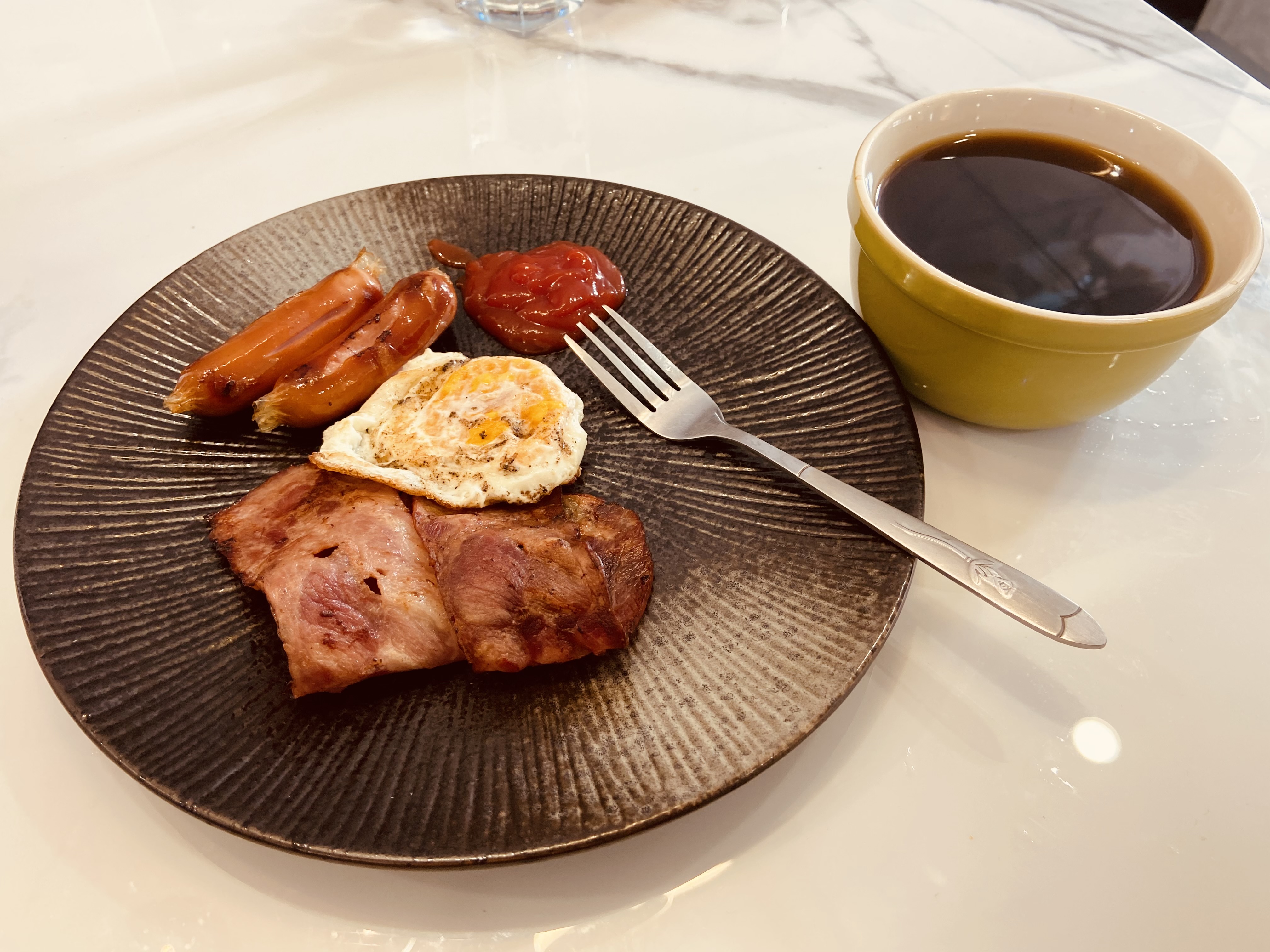 한때 거의 매주 일요일 아침겸 점심으로 먹었던 식단이다. 주중에 아침을 먹지 않았을 당시, 일요일 아침에는 자전거를 타고 와서 출출하였기에 후다닥 10분이면 차려 먹을 수 있는 장점이 있다. 소시지, 베이컨, 계란 후라이를 따로 해도 되지만, 프라이팬 상에 위치만 대충 맞춰서 한꺼번에 요리하면서 커피메이커에 커피를 내리기 시작하면, 커피가 다 내려졌을 때 요리도 다 끝낼 수 있다. 양은 적지만, 고단백에 고지방 음식이고 캐첩까지 먹으면 고설탕이기도 하다.