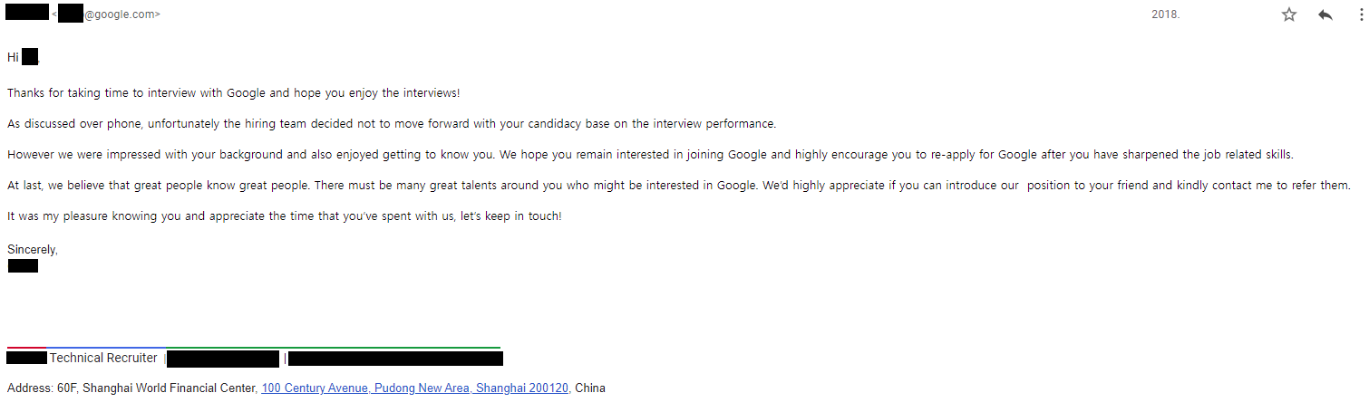 마지막으로 디렉터한테 연락이 왔었다. 의견이 약간 나뉘는데, 자신은 꼭 뽑고 싶다고, 그런데 채용에 반대한 사람들이 있어서 면접을 한두개 정도 더 봐야 한다는 것이었다. 우선 알겠다고 했는데, 다시 상하이로 오라고 하는 초청에 싫다고 하였고, 화상 면접도 업무시간에 보는 것은 싫다고 하였다. 결국은 일요일 아침에 전화 면접을 보는 것으로 하였는데, 너무 많이 싫다고 해서 이미 이때 구글에서도 포기했었던 듯 했다. 면접관이 갑자기 왜 자기가 면접을 봐야하는지 모르겠다고 하면서.... 뭐 별 이야기도 하지 않고 면접은 끝났고, 몇일 뒤 탈락했다는 메일을 받았다.