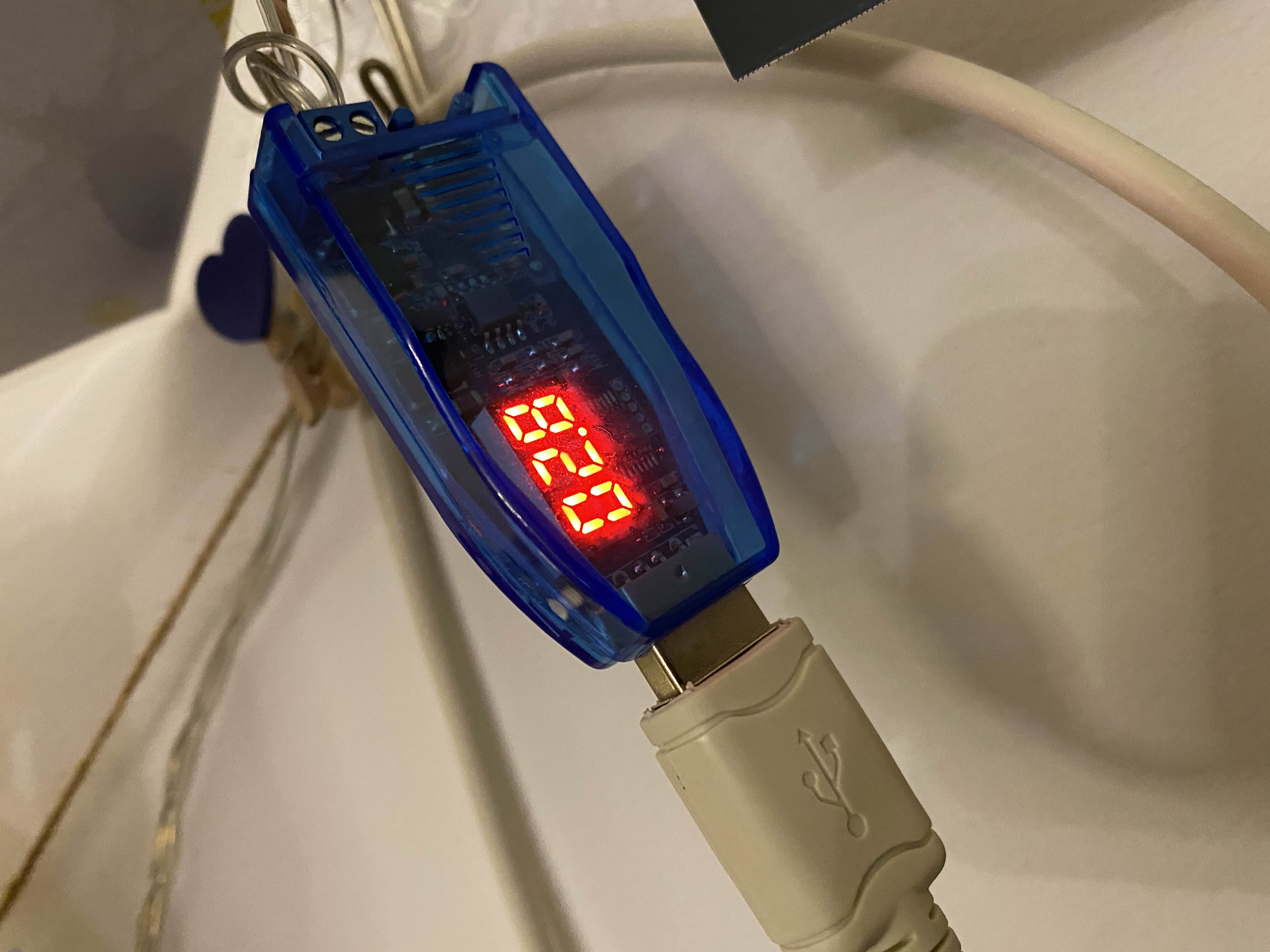 기존의 건전지를 넣는 곳을 잘라내고, 두개의 장식용등을 병렬로 연결한 후, 구매한 변압기에 연결해 주면 끝. 가변변압기의 입력단은 USB 형태로 되어 있는 것을 샀기 때문에 입력은 5V로 고정되어 있다. 출력전압 조절도 가능한데, 원래 1.5V두개를 직렬로 사용하는 것이라 3.0V를 사용해야 하지만, 야간 무드등으로 사용하기에는 야간에 거실이 너무 밝아서 2.8V로 낮추어서 사용하고 있다. 2.7V로 낮추면 전등이 매우 불안정하게 들어오는 것으로 보아 최소 필요 전압이 2.8V인 듯 하다. 2.8V로 사용하면 무드등으로 사용하기에 밝기도 괜찮고, 출력 전류량이 3.0V일 때의 1/10로 줄어드는 현상이 있어 전기 소모량도 훨씬 적어 더 나은 듯 하다.