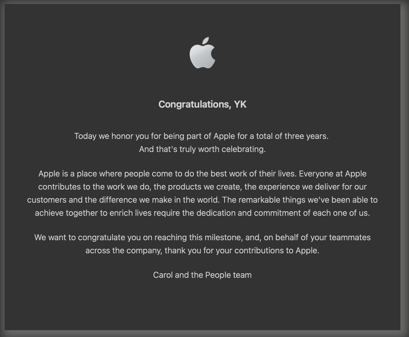 애플로 이직한지 3년이 되었다. 올해도 도착한 축하 메모.